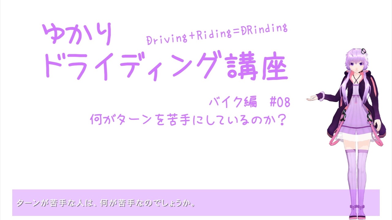 左ターンと右ターン、どちらが苦手ですか?<br>ターンが苦手な人は、曲げること自体はできている人が多いように思います。<br>では、ターンを苦手にしているものは何なのでしょうか?<br>人によって、左右どちらかができて、どちらかが苦手ということがよく見られます。<br>そこにはある共通点があるように思います。<br><br>04/Sep/2019記<br>続編はもうしばらくお待ちください。<br>MMDのモーショントレースで道草食ってます。m(_ _)m<br><br>YouTube<span style="font-size: 12px;">版</span> → <a href="https://goo.gl/agFSRa" target="_blank" rel="noopener nofollow">https://goo.gl/agFSRa</a><br><span style="font-size: 12px;">いつ更新するかわからないブログ</span> → <a href="http://knntie.seesaa.net/" target="_blank" rel="noopener nofollow">http://knntie.seesaa.net/</a> <br><br>ドライディング講座のマイリスト → <a href="https://www.nicovideo.jp/mylist/60466506" target="_blank" rel="noopener">mylist/60466506</a><br><span style="font-size: 13px;">ドライディング講座のシリーズ → </span><span style="color: #252525; font-size: 13px;"><a href="https://www.nicovideo.jp/series/4909" target="_blank" rel="noopener">series/4909</a></span><br><a href="https://www.nicovideo.jp/watch/sm35113327" class="watch">sm35113327</a>←<span style="font-size: 12px;">前|次</span>→
