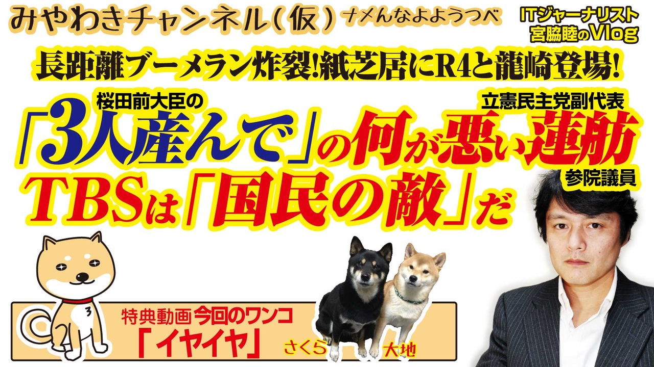 長距離ブーメラン炸裂!紙芝居にレンホーと龍崎タカーシ登場!<br>立憲民主党副代表・蓮舫・参議院議員の「許せない」発言と桜田前大臣の「3人産んで」のどっちが悪いか。<br>いずれにせよ政治家のクビを求めるテレビとTBSは「国民の敵」だろ。<br><br>0:08 3人生んで欲しいに噛みつくR4に…<br>2:23 猪口(与謝野)VS蓮舫を知っているか<br>5:15 至芸・ブーメラン!ポンコツな2人説<br>7:42 政治家のクビを獲れるのは国民だけだが<br>10:46 55年でテレビは「国民の敵」になった<br>14:34 今回のワンコ「いやいや」<br><br>みやわきチャンネル(仮)#467Restart325<br>(旧・マスコミでは言えないこと)<br>オリジナル2019年5月30日配信<br><br>番組の最後に「柴犬」のコーナーがあります。<br>今回のワンコ「いやいや」<br><br>■わんこ総集編はこちらから!<br>何かあっても大丈夫、のはず。仮にこの「ワンコチャンネル」になにかあれば・・・オッス、○○と。<br>今回のワンコ総集編〜さくら&大地〜<br><a href="https://www.youtube.com/channel/UChwY..." target="_blank" rel="noopener nofollow">https://www.youtube.com/channel/UChwY...</a><br><br>■ニコニコ動画<br><a href="http://www.nicovideo.jp/user/13610165" target="_blank" rel="noopener nofollow">http://www.nicovideo.jp/user/13610165</a><br>■FRESH LIVE<br><a href="https://freshlive.tv/miyawaki-ch" target="_blank" rel="noopener nofollow">https://freshlive.tv/miyawaki-ch</a><br>■FC2動画<br><a href="https://video.fc2.com/account/16696711" target="_blank" rel="noopener nofollow">https://video.fc2.com/account/16696711</a><br>■YouTube(理不尽に消えることあり)<br><a href="https://www.youtube.com/c/AtsushiMiyawaki" target="_blank" rel="noopener nofollow">https://www.youtube.com/c/AtsushiMiyawaki</a><br><br>■いつ「消える」かわかりません。<br>そこでオフィシャルサイトで「非常用連絡先」をご確認ください。<br>「みやチャン(仮)」公式サイト「MiyawakiNewsNetwork」<br><a href="http://www.miyawakiatsushi.net" target="_blank" rel="noopener nofollow">http://www.miyawakiatsushi.net</a><br><br>■理不尽に消えたとき、以下で情報配信しております。ぜひ、ご登録ください。<br><br>■ツイッター<br><a href="https://twitter.com/miyawakiatsushi" target="_blank" rel="noopener nofollow">https://twitter.com/miyawakiatsushi</a><br>■Facebook<br><a href="https://www.facebook.com/miyawakiatsushi" target="_blank" rel="noopener nofollow">https://www.facebook.com/miyawakiatsushi</a>