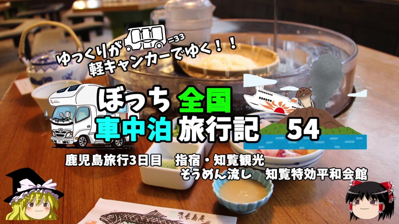 <span style="color: #ff0000; font-size: medium;"><u>※Youtubeで1話分、先行配信中 </u></span><br><span style="color: #0000ff; font-size: medium;"> <a href="http://www.youtube.com/c/なめこのぼっち旅" target="_blank" rel="noopener nofollow">http://www.youtube.com/c/なめこのぼっち旅</a></span> <br><br>今回は唐船峡名物 そうめん流しを頂きます!<br>真冬に・・・<br>そして知覧へ・・・。<br><br><span style="color: #ff0000;">コミュニティー→co2910020</span><br> twitter→<a href="https://twitter.com/ryontan" target="_blank" rel="noopener nofollow">https://twitter.com/ryontan</a><br><br><a href="https://www.nicovideo.jp/watch/sm35172634" class="watch">sm35172634</a>←前回 <span style="color: #ff0000;">次回 55話→</span><a href="https://www.nicovideo.jp/watch/sm35235709" class="watch">sm35235709</a><br><br>解説・雑談系→<a href="https://www.nicovideo.jp/mylist/63171869" target="_blank" rel="noopener">mylist/63171869</a><br>今作 韓国トルコ旅行記→<a href="https://www.nicovideo.jp/mylist/63654428" target="_blank" rel="noopener">mylist/63654428</a><br>今作 車中泊旅行記→<a href="https://www.nicovideo.jp/mylist/54706524" target="_blank" rel="noopener">mylist/54706524</a><br>前作 久米島(沖縄)旅行記→<a href="https://www.nicovideo.jp/mylist/63059251" target="_blank" rel="noopener">mylist/63059251</a><br>イギリスタイ旅行記→<a href="https://www.nicovideo.jp/mylist/60044833" target="_blank" rel="noopener">mylist/60044833</a><br>クルーズ旅行記→<a href="https://www.nicovideo.jp/mylist/57397685" target="_blank" rel="noopener">mylist/57397685</a><br>ドイツ周遊記→<a href="https://www.nicovideo.jp/mylist/54938346" target="_blank" rel="noopener">mylist/54938346</a><br>北海道旅行記→<a href="https://www.nicovideo.jp/mylist/52618057" target="_blank" rel="noopener">mylist/52618057</a><br>アメリカ横断記→<a href="https://www.nicovideo.jp/mylist/48621785" target="_blank" rel="noopener">mylist/48621785</a><br>イタリア周遊記→<a href="https://www.nicovideo.jp/mylist/45763559" target="_blank" rel="noopener">mylist/45763559</a><br>NY旅行記→<a href="https://www.nicovideo.jp/mylist/44343854" target="_blank" rel="noopener">mylist/44343854</a>