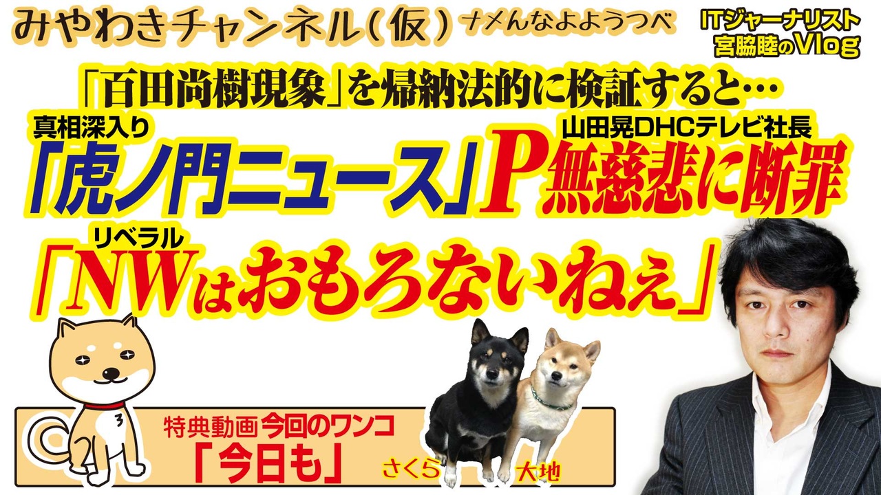 「真相深入り虎ノ門ニュース」 プロデューサー、山田晃DHCテレビ社長が無慈悲に「リベラルはおもろない」と断罪。<br>ニューズウィーク日本版「百田尚樹現象」を帰納法的に検証すると、リベラルが「嫌われる」理由が明らかになった。<br><br>0:08 虎8山田P兼社長の無慈悲すぎる断罪<br>2:37 リベラル「おもろない」理由はダブスタ<br>4:11 弱者を気取るニューズウィーク編集部<br>7:52 南京事件とWGIPのご飯論法的な否定<br>11:02 もう、ダイヤル廻さず、ポケベル鳴らず<br>14:40 今回のワンコ「今日も」<br><br>みやわきチャンネル(仮)#476Restart334<br>(旧・マスコミでは言えないこと)<br>オリジナル2019年6月8日配信<br><br>番組の最後に「柴犬」のコーナーがあります。<br>今回のワンコ「今日も」<br><br>■わんこ総集編はこちらから!<br>何かあっても大丈夫、のはず。仮にこの「ワンコチャンネル」になにかあれば・・・オッス、○○と。<br>今回のワンコ総集編〜さくら&大地〜<br><a href="https://www.youtube.com/channel/UChwY..." target="_blank" rel="noopener nofollow">https://www.youtube.com/channel/UChwY...</a><br><br>■ニコニコ動画<br><a href="http://www.nicovideo.jp/user/13610165" target="_blank" rel="noopener nofollow">http://www.nicovideo.jp/user/13610165</a><br>■FRESH LIVE<br><a href="https://freshlive.tv/miyawaki-ch" target="_blank" rel="noopener nofollow">https://freshlive.tv/miyawaki-ch</a><br>■FC2動画<br><a href="https://video.fc2.com/account/16696711" target="_blank" rel="noopener nofollow">https://video.fc2.com/account/16696711</a><br>■YouTube(理不尽に消えることあり)<br><a href="https://www.youtube.com/c/AtsushiMiyawaki" target="_blank" rel="noopener nofollow">https://www.youtube.com/c/AtsushiMiyawaki</a><br><br>■いつ「消える」かわかりません。<br>そこでオフィシャルサイトで「非常用連絡先」をご確認ください。<br>「みやチャン(仮)」公式サイト「MiyawakiNewsNetwork」<br><a href="http://www.miyawakiatsushi.net" target="_blank" rel="noopener nofollow">http://www.miyawakiatsushi.net</a><br><br>■理不尽に消えたとき、以下で情報配信しております。ぜひ、ご登録ください。<br><br>■ツイッター<br><a href="https://twitter.com/miyawakiatsushi" target="_blank" rel="noopener nofollow">https://twitter.com/miyawakiatsushi</a><br>■Facebook<br><a href="https://www.facebook.com/miyawakiatsushi" target="_blank" rel="noopener nofollow">https://www.facebook.com/miyawakiatsushi</a>