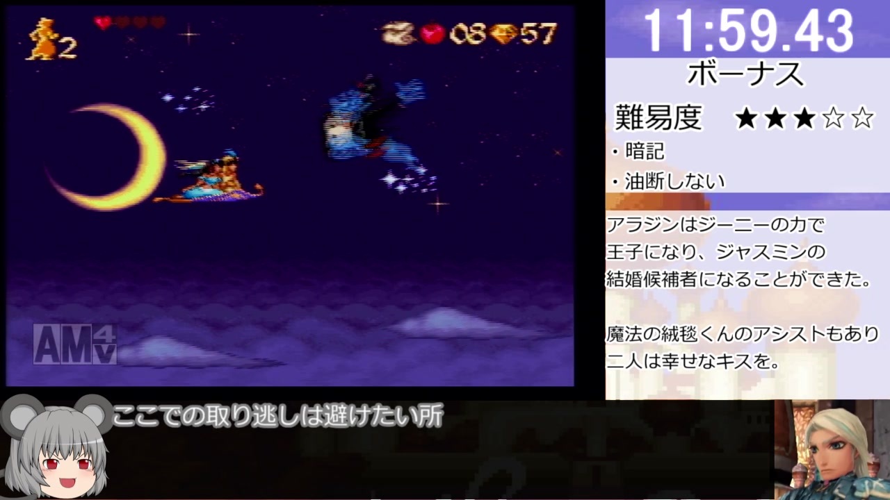 実写版アラジン公開記念なので初投稿です。<br><br><span style="color: #000000; font-size: 14px;">実機、純正コントローラー使用<br>any%=達成度問わず=赤ダイヤを全部集めなくてよいというレギュレーションです。<br><br>計測区間 と順位(2019/6/9現在)<br>日本基準(スタート~蛇撃破後のセリフ開始):17分7秒(1位/ 12人)<br>世界基準(スタート~蛇撃破):16分34秒(4位/ 123人)</span><br><br>無編集(コメント解説版):<a href="https://www.nicovideo.jp/watch/sm34188526" class="watch">sm34188526</a><br><span style="color: #000000; font-size: 14px;">ニコ生放送コミュニティ:</span><span style="color: #006699; font-size: 14px;">co3668268</span><br>