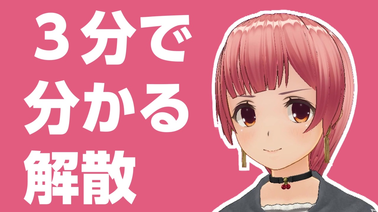 最近、巷で衆議院の解散がささやかれています。<br>でも、そもそも「解散」って何?ゼロから解説します。<br><br>【目次】<br><a href="#" class="seekTime" data-seekTime="0:12" onclick="seekNicoPlayer('#0:12'); return false;">#0:12</a> 解散って?<br><a href="#" class="seekTime" data-seekTime="0:42" onclick="seekNicoPlayer('#0:42'); return false;">#0:42</a> 二種類の解散<br><a href="#" class="seekTime" data-seekTime="0:56" onclick="seekNicoPlayer('#0:56'); return false;">#0:56</a> 69条解散<br><a href="#" class="seekTime" data-seekTime="1:41" onclick="seekNicoPlayer('#1:41'); return false;">#1:41</a> 7条解散<br><a href="#" class="seekTime" data-seekTime="2:49" onclick="seekNicoPlayer('#2:49'); return false;">#2:49</a> まとめ<br><br>Twitter: <a href="https://twitter.com/PoliticsMinchan" target="_blank" rel="noopener nofollow">https://twitter.com/PoliticsMinchan</a><br>総合Mylist: <a href="https://www.nicovideo.jp/mylist/61895449" target="_blank" rel="noopener">mylist/61895449</a><br>教えて!みーちゃん(用語解説): <a href="https://www.nicovideo.jp/mylist/62980169" target="_blank" rel="noopener">mylist/62980169</a><br>前の動画: <span style="color: #000000; font-size: 13px;"><a href="https://www.nicovideo.jp/watch/sm35039286" class="watch">sm35039286</a></span> 次の動画: まだ<br>Youtube版: <a href="https://youtu.be/uWI1EfkJzyI" target="_blank" rel="noopener nofollow">https://youtu.be/uWI1EfkJzyI</a><br><br>※ニコニコのコメントには返信できないので、返信が必要な場合はTwitterにリプライをください。<br>※「みーちゃんの政治ちゃんねる」はCOM3D2を使用して制作しています。