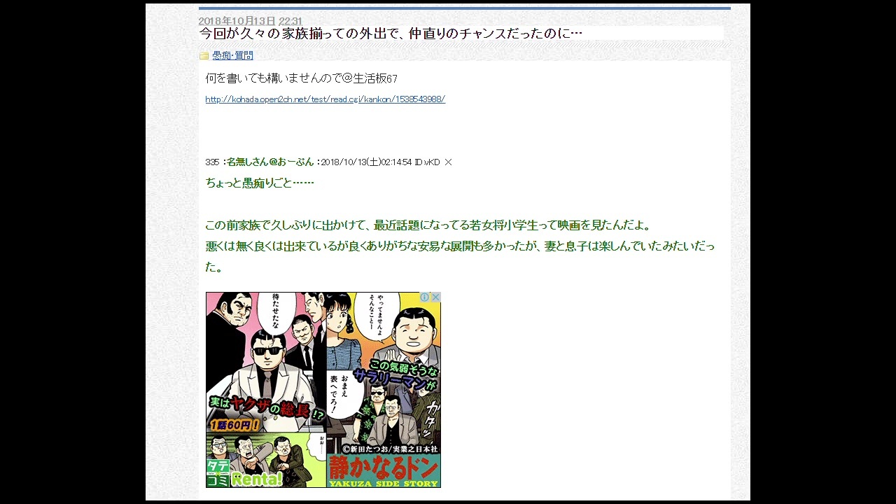 取り急ぎ。<br>今回が久々の家族揃っての外出で、仲直りのチャンスだったのに… : 気団談<br><a href="http://blog.livedoor.jp/kidandan/archives/54282039.html" target="_blank" rel="noopener nofollow">http://blog.livedoor.jp/kidandan/archives/54282039.html</a><br>妻から再び信頼されたいんだけど、どうしたら良いのかな? : 気団談<br><a href="http://blog.livedoor.jp/kidandan/archives/54416702.html" target="_blank" rel="noopener nofollow">http://blog.livedoor.jp/kidandan/archives/54416702.html</a><br><br>↓は信憑性が低いと判断して除外しました。<br><a href="https://kohada.open2ch.net/test/read.cgi/kankon/1489655833/?id=mpY" target="_blank" rel="noopener nofollow">https://kohada.open2ch.net/test/read.cgi/kankon/1489655833/?id=mpY</a><br><br>6月14日に動画タイトルを若干変更しました。(「ムクリエイター」→「けものフレンズ?」)<br><br>追記:あかつきごもく様に確認したところ、「<span style="color: #333333; font-size: 14px;">うちの家族全員若おかみは見に行っていないので、違う方ですね」との回答をいただきました。</span><br><br>前作 【けもフレ新説シリーズ】けものフレンズプロジェクト ヤクザとつながっている説 <a href="https://www.nicovideo.jp/watch/sm34987479" class="watch">sm34987479</a>