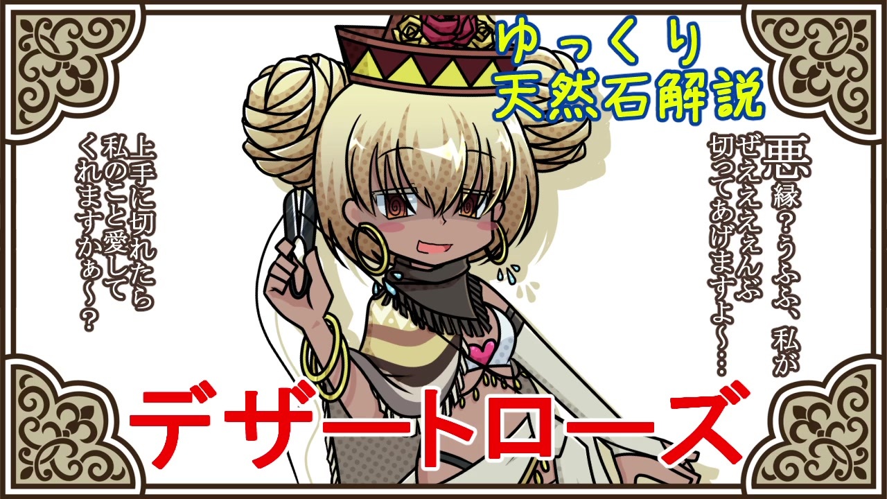 天然石・鉱物・パワーストーンをゆっくり解説していきます。<br><br>ヤンデレで色黒のキャラってあんまり見たことないね<br><br>茶番飛ばし→<a href="#" class="seekTime" data-seekTime="1:33" onclick="seekNicoPlayer('#1:33'); return false;">#1:33</a> ~<br><br>擬人化の全身絵とちょっとした小ネタは静画参照→<a href="https://seiga.nicovideo.jp/seiga/im9356412" target="_blank" rel="noopener">im9356412</a><br><br>前→<a href="https://www.nicovideo.jp/watch/sm35203988" class="watch">sm35203988</a>(part 21 デンドライト)<br><br>part 0→<a href="https://www.nicovideo.jp/watch/sm33864263" class="watch">sm33864263</a><br><br>ゆっくり天然石解説マイリス【<a href="https://www.nicovideo.jp/mylist/63380566" target="_blank" rel="noopener">mylist/63380566</a>】<br><br>次→<a href="https://www.nicovideo.jp/watch/sm35302523" class="watch">sm35302523</a>(part 23 ブラックオニキス)<br><br><br>wikiでのご紹介ありがとうございます!<br><a href="https://nicokaisetsu.wiki.fc2.com/wiki/ねりけしぽんす%2F天然石・鉱物・パワーストーンをゆっくり解説" target="_blank" rel="noopener nofollow">https://nicokaisetsu.wiki.fc2.com/wiki/ねりけしぽんす%2F天然石・鉱物・パワーストーンをゆっくり解説</a><br><br>.:*゚..:。:..:*゚..:。:. 【作者Twitter】.:*゚:.。:..:*゚:.。:.<br><br><br><a href="https://twitter.com/nerikeshi_pons" target="_blank" rel="noopener nofollow">https://twitter.com/nerikeshi_pons</a><br><br><br>.:*゚..:。:..:*゚..:。:. 【使用素材】.:*゚:.。:..:*゚:.。:.<br><br><br>背景画像…【creativefreaks】<br><br><a href="http://creativefreaks.net/?lang=ja/" target="_blank" rel="noopener nofollow">http://creativefreaks.net/?lang=ja/</a><br><br><br>BGM …【DOVA-SYNDROME】<br><a href="https://dova-s.jp/" target="_blank" rel="noopener nofollow">https://dova-s.jp/</a><br />「いいね」をすると本編シリーズでは「担当擬人化キャラの一言」みたいなお礼?メッセージが、<br>番外編などではきゆくろのつぶやきとかがあります。<br>これと言って誰も得しないシリーズですがうp主の黒歴史を覗き見するつもりでどうぞ。