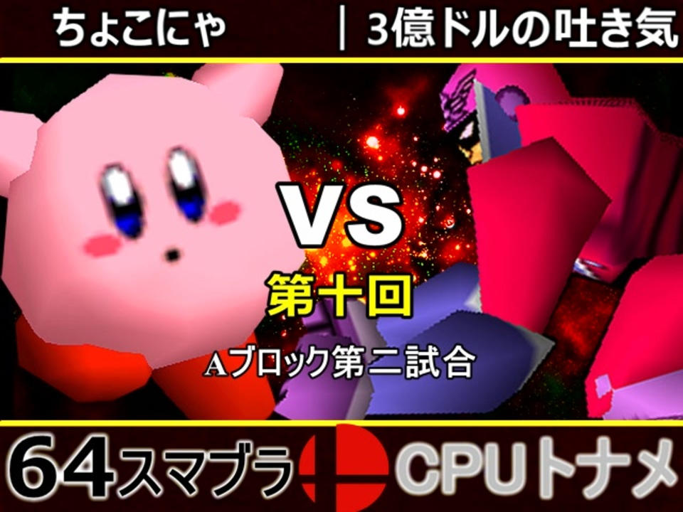 第八回では辛くも吐き気が勝ったが今回はどうなるか<br><span style="color: #000000; font-size: 14px;">※どちらが勝つかアンケ結果(Twitter調べ) <br>ちょこにゃ(KI) 25% VS 3億ドルの吐き気(FA) 75%</span><br><br><span style="color: #0000ff;"><u>※64スマブラCPUトナメ実況のwikiができた模様</u></span><span style="color: #0000ff;">→</span> <a href="https://wiki3.jp/64cpu_P" target="_blank" rel="noopener nofollow">https://wiki3.jp/64cpu_P</a><br><br><span style="color: #ff0000; font-size: 24px;"><strong>次→</strong></span>【<a href="https://www.nicovideo.jp/watch/sm35256302" class="watch">sm35256302</a>】※毎日投稿<br><br>Aブロック第一試合【<a href="https://www.nicovideo.jp/watch/sm35254266" class="watch">sm35254266</a>】<br><span style="color: #000000; font-size: 14px;">第十回選手紹介動画【</span><span style="color: #006699; font-size: 14px;"><a href="https://www.nicovideo.jp/watch/sm35240933" class="watch">sm35240933</a></span><span style="color: #000000; font-size: 14px;">】</span><br>第十回マイリスト【<a href="https://www.nicovideo.jp/mylist/65788927" target="_blank" rel="noopener">mylist/65788927</a>】<br>64スマブラCPUトナメ実況part1まとめ【<a href="https://www.nicovideo.jp/mylist/60846861" target="_blank" rel="noopener">mylist/60846861</a>】<br>その他シリーズ【<a href="https://www.nicovideo.jp/mylist/12965027" target="_blank" rel="noopener">mylist/12965027</a>】<br><br><span style="color: #00bfff;"><strong>Twitter</strong></span>【<a href="https://twitter.com/niconicopppppp" target="_blank" rel="noopener nofollow">https://twitter.com/niconicopppppp</a> 】<br><span style="color: #ff4500;"><strong>チャンネル</strong></span>【<a href="https://ch.nicovideo.jp/p-desu" target="_blank" rel="noopener">ch.nicovideo.jp/p-desu</a>】