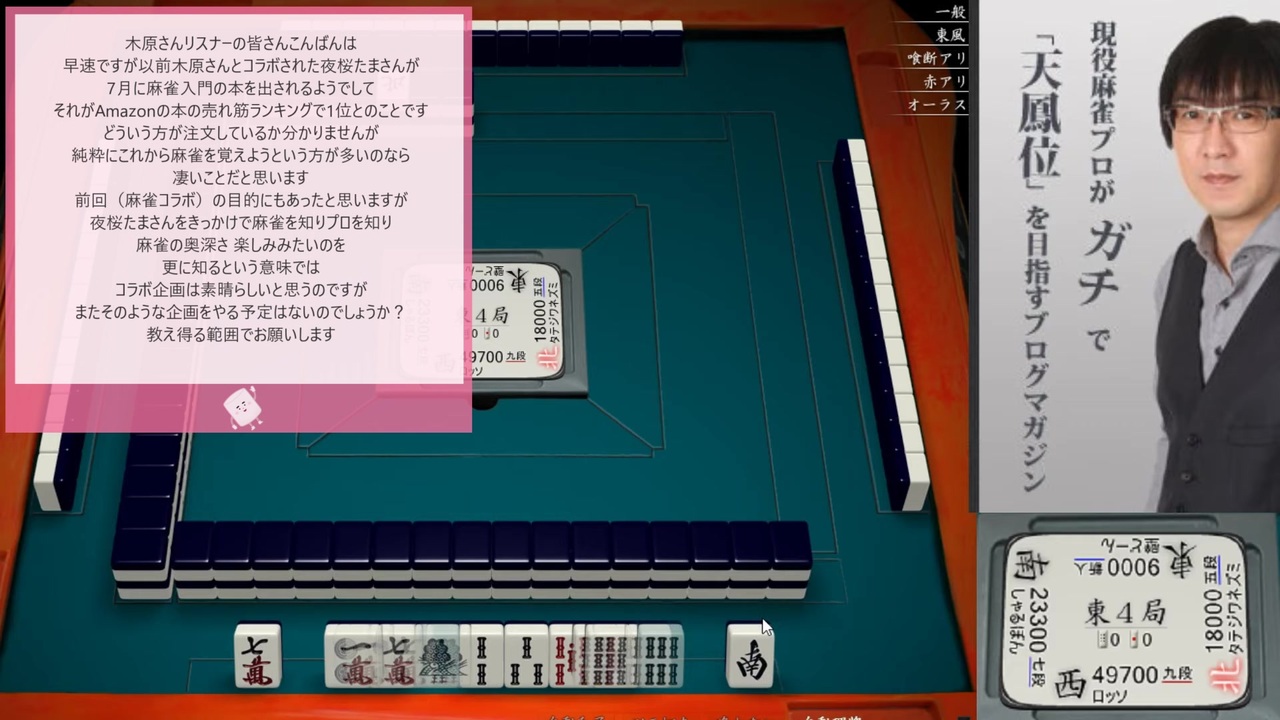 たまーじゃん本に関するお便りに答える木原プロの切り抜きです<br>編集の関係で対局状況が所々飛んでいます すみません<br><br>□元動画<br>■月曜日を迎えたくない人のためのブログマガジン杯ワンディ予選<br> <a href="https://www.youtube.com/watch?v=PB_toC69CcU" target="_blank" rel="noopener nofollow">https://www.youtube.com/watch?v=PB_toC69CcU</a><br>□関連リンク<br>■木原プロTwitter YouTubeチャンネル<br> <a href="https://twitter.com/sonoharasaika" target="_blank" rel="noopener nofollow">https://twitter.com/sonoharasaika</a><br> <a href="https://www.youtube.com/channel/UCXECPzf89p9kMTpZBvBcH1A" target="_blank" rel="noopener nofollow">https://www.youtube.com/channel/UCXECPzf89p9kMTpZBvBcH1A</a><br>■【麻雀コラボ】てつじんのまぁじゃん - 挑戦者 夜桜たま -【アイドル部】<br> <a href="https://www.youtube.com/watch?v=_q33PBEgViQ" target="_blank" rel="noopener nofollow">https://www.youtube.com/watch?v=_q33PBEgViQ</a><br><s>■【Amazon.co.jp 限定】たまーじゃん 夜桜たまがマンガで教える麻雀入門 (再度在庫なくなりました)<br> <a href="https://amazon.co.jp/dp/B07STB6QHC" target="_blank" rel="noopener nofollow">https://amazon.co.jp/dp/B07STB6QHC</a></s><br>■たまーじゃん 夜桜たまがマンガで教える麻雀入門(通常版)<br> <a href="https://amazon.co.jp/dp/404065921X" target="_blank" rel="noopener nofollow">https://amazon.co.jp/dp/404065921X</a><br>