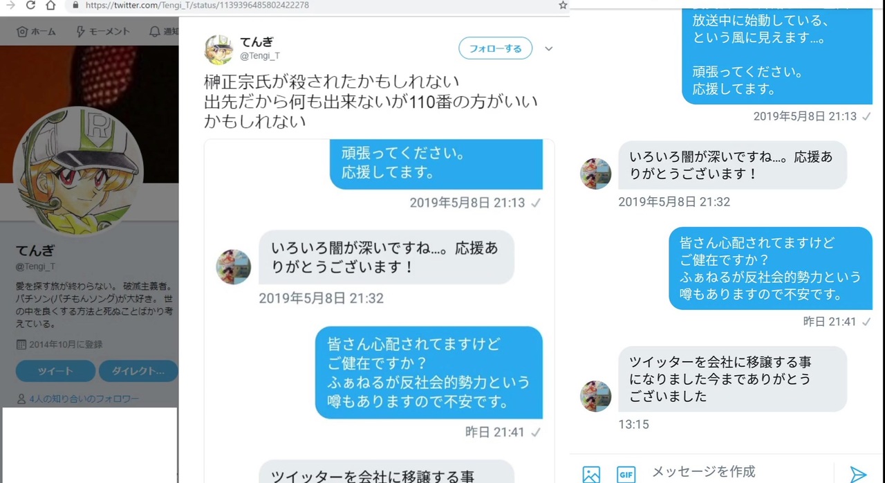 榊正宗氏の安否確認を匿名通報する手順<br><a href="https://www.nicovideo.jp/watch/sm35266174" class="watch">sm35266174</a><br><br>取り急ぎ。<br><br><a href="https://twitter.com/Tengi_T/status/1139396485802422278" target="_blank" rel="noopener nofollow">https://twitter.com/Tengi_T/status/1139396485802422278</a><br><a href="https://archive.fo/amxO0" target="_blank" rel="noopener nofollow">https://archive.fo/amxO0</a><br><br><a href="https://twitter.com/Tengi_T/status/1139398804325560326" target="_blank" rel="noopener nofollow">https://twitter.com/Tengi_T/status/1139398804325560326</a><br><a href="https://archive.fo/zwTTh" target="_blank" rel="noopener nofollow">https://archive.fo/zwTTh</a><br><br><br>追記<br>>ワイトキングは動画にしてアップロードする前にすこし冷静になってほしい<br>冷静になる時間で大事になるくらいなら取り急ぎます。<br>ですがタイトルは変えました。てんぎ氏、申し訳ありません。<br><br>>委譲した会社がAGNの可能性もあるのが怖いよな<br>>あー「会社に」って自分の会社じゃない可能性があるわけか…<br>こわい…。<br><br>>ワイトキングはここにいるのか<br>太陽がいつもとしあきを見ているよ<br>夜行性でもちょっと見てるよ<br>(サーかばJrコラあき、バッタ細にぃ、ありがとね。癒されました)<br><br>>なんならワイトキングが書き込んでる可能性だってある<br>>見つけてどうこうできるものでもなし<br>ご想像にお任せします。<br><br>>まぁ本格的に動く為の準備だと思おうよ<br>>弁護士から強制的にストップ命令出たのかもしれんし<br>>ぶっちゃけもし何かあったなら既に手遅れだし前向きに捉えよう<br>>そうしないと胃が死ぬ<br>そうであってほしい…。<br><br>>538 無念 Name としあき 19/06/14(金)14:36:36 <strong>IP:2400:4052.*(ipv6) </strong>No.646282681 <br>>みんな榊=ふぁねる開示の道具として見てるから麻痺してるんだろうけど、<br>>榊氏の言動はずん子にとって明らかにマイナスイメージになるような事ばっかりしてたからね<br><br>>ふぁねる抜きで考えても会社側から止められてもなんらおかしくない言動だらけ<br>>(最近だと海獣の子供に対するサゲまくり)、<br>>以前からずん子の原作者の自分が外れるのがどうとか言ってたし、社内で問題視されてたんでしょ<br>おめぇの出番だ。ジョニィ。<br><br>><span style="color: #000000; font-size: 13px;"><strong>IP:2400:4052.*(ipv6)<br>b</strong></span>