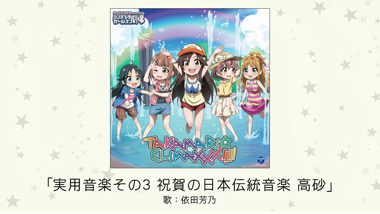 転載 <a href="https://www.youtube.com/watch?v=NLoutBoshVA" target="_blank" rel="noopener nofollow">https://www.youtube.com/watch?v=NLoutBoshVA</a><br><br>2019年6月19日発売予定<br> THE IDOLM@STER CINDERELLA GIRLS LITTLE STARS! TAKAMARI☆CLIMAXXX!!!!!<br> 歌:喜多日菜子、喜多見柚、南条光、日野茜、姫川友紀<br> COCC-17613[CD1枚組] ¥1,111+税<br><br> 収録内容 Tr.01 TAKAMARI☆CLIMAXXX!!!!!<br> 作詞・作曲・編曲:広川恵一(MONACA)<br> 歌:喜多日菜子、喜多見柚、南条光、日野茜、姫川友紀<br> Tr.02 TAKAMARI☆CLIMAXXX!!!!! 喜多日菜子ソロ・リミックス 歌:喜多日菜子<br> Tr.03 TAKAMARI☆CLIMAXXX!!!!! 喜多見柚ソロ・リミックス 歌:喜多見柚<br> Tr.04 TAKAMARI☆CLIMAXXX!!!!! 南条光ソロ・リミックス 歌:南条光<br> Tr.05 TAKAMARI☆CLIMAXXX!!!!! 日野茜ソロ・リミックス 歌:日野茜<br> Tr.06 TAKAMARI☆CLIMAXXX!!!!! 姫川友紀ソロ・リミックス 歌:姫川友紀<br> Tr.07 TAKAMARI☆CLIMAXXX!!!!! オリジナル・カラオケ<br> ボーナストラック<br> Tr.08 実用音楽その3 祝賀の日本伝統音楽 高砂 歌:依田芳乃<br><br> Starring by 喜多日菜子(CV:深川芹亜)、喜多見柚(CV:武田羅梨沙多胡)、南条光(CV:神谷早矢佳)、 日野茜(CV:赤﨑千夏)、姫川友紀(CV:杜野まこ)、依田芳乃(CV:高田憂希)<br> ★7thLIVEの先行抽選予約申込用のシリアルナンバー封入!
