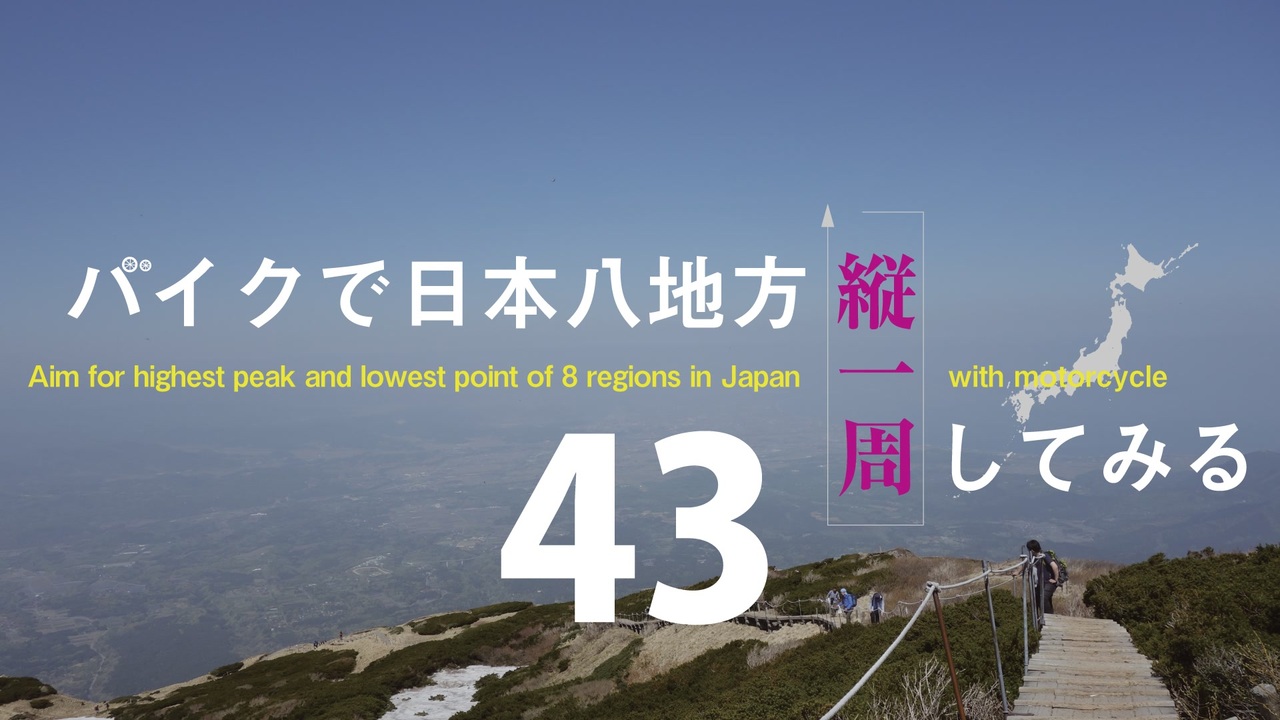 どうも、sinobiです。<br><br>登山パート、伯耆大山RTA回です。<br>今までで一番天気に恵まれた登山日でした。<br>どこを使っても綺麗だったので、<br>カットするのが勿体なかった。(´・ω・`)<br><br><br>この動画は、日本の8地方の最高地点と最低地点を目指してバイクで旅をする動画になる予定です。<br><br>バイク:SUZUKI ST250 E type<br>カメラ:Sony AS300 / RX100(動画)・RX100(写真)<br>マウント:MINOURA VC100-S + HAKUBA BH-1(ハンドルマウント)<br>Sony AKA-CAP1 C SYH(キャップクリップ)<br><br>twitter:@sinobi40<br><br>■part1:<a href="https://www.nicovideo.jp/watch/sm32831702" class="watch">sm32831702</a><br>■part42:<a href="https://www.nicovideo.jp/watch/sm35238047" class="watch">sm35238047</a> ← <a href="https://www.nicovideo.jp/mylist/61189812" target="_blank" rel="noopener">mylist/61189812</a> → ■part44:<a href="https://www.nicovideo.jp/watch/sm35299686" class="watch">sm35299686</a><br><br>■40のおっさんが北海道をバイクで一周するための作戦会議(前作) <a href="https://www.nicovideo.jp/mylist/58076009" target="_blank" rel="noopener">mylist/58076009</a><br>■40のおっさんがグダグダツーリング(スピンオフ) <a href="https://www.nicovideo.jp/mylist/58957026" target="_blank" rel="noopener">mylist/58957026</a><br>■スコットランド行ってきた(現行別作) <a href="https://www.nicovideo.jp/mylist/64596656" target="_blank" rel="noopener">mylist/64596656</a>