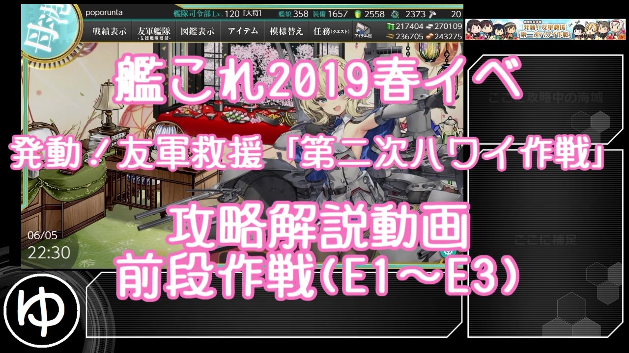 艦隊これくしょん 2019春イベント 発動!友軍救援「第二次ハワイ作戦」のゆっくり攻略解説動画です。<br>基本的には甲難易度の攻略についての解説になります。<br>提督レベル120、ALL甲難易度、重婚、ダメコン不使用、微課金提督の攻略です。<br>すべて友軍実装前の攻略なので、あくまで一例となります。<br>各提督は自分の艦隊と相談しながら参考程度にご覧いただけると幸いです。<br><br>参考にさせていただいたサイト達<br>艦これwiki様<br>ラムダ様のブロマガ><a href="https://ch.nicovideo.jp/article/ar1765248" target="_blank" rel="noopener">ar1765248</a><br>ぜかましねっと様>zekamashi.net<br><br>前編>[これ]<br>後編><a href="https://www.nicovideo.jp/watch/sm35267585" class="watch">sm35267585</a><br><br>艦これマイリス><a href="https://www.nicovideo.jp/mylist/45265838" target="_blank" rel="noopener">mylist/45265838</a><br>その他雑多マイリス:<a href="https://www.nicovideo.jp/mylist/29124403" target="_blank" rel="noopener">mylist/29124403</a><br>コミュ >> co1309914<br>ひっそりTwitterもやってます @majin_poporunta