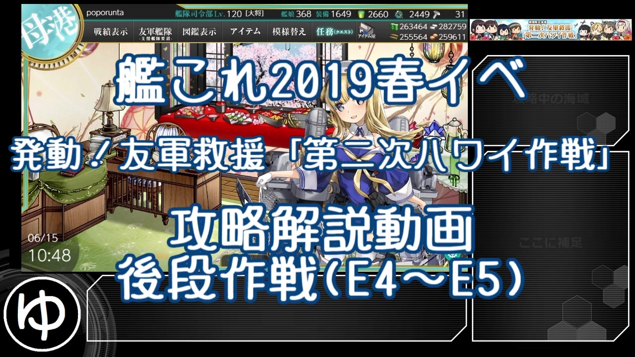 艦隊これくしょん 2019春イベント 発動!友軍救援「第二次ハワイ作戦」のゆっくり攻略解説動画です。<br>基本的には甲難易度の攻略についての解説になります。<br>提督レベル120、ALL甲難易度、重婚、ダメコン不使用、微課金提督の攻略です。<br>すべて友軍実装前の攻略なので、あくまで一例となります。<br>各提督は自分の艦隊と相談しながら参考程度にご覧いただけると幸いです。<br><br>参考にさせていただいたサイト達<br>艦これwiki様<br>ラムダ様のブロマガ><a href="https://ch.nicovideo.jp/article/ar1765248" target="_blank" rel="noopener">ar1765248</a><br>ぜかましねっと様>zekamashi.net<br><br>前編><a href="https://www.nicovideo.jp/watch/sm35267040" class="watch">sm35267040</a><br>後編>[これ]<br><br>艦これマイリス><a href="https://www.nicovideo.jp/mylist/45265838" target="_blank" rel="noopener">mylist/45265838</a><br>その他雑多マイリス:<a href="https://www.nicovideo.jp/mylist/29124403" target="_blank" rel="noopener">mylist/29124403</a><br>コミュ >> co1309914<br>ひっそりTwitterもやってます @majin_poporunta