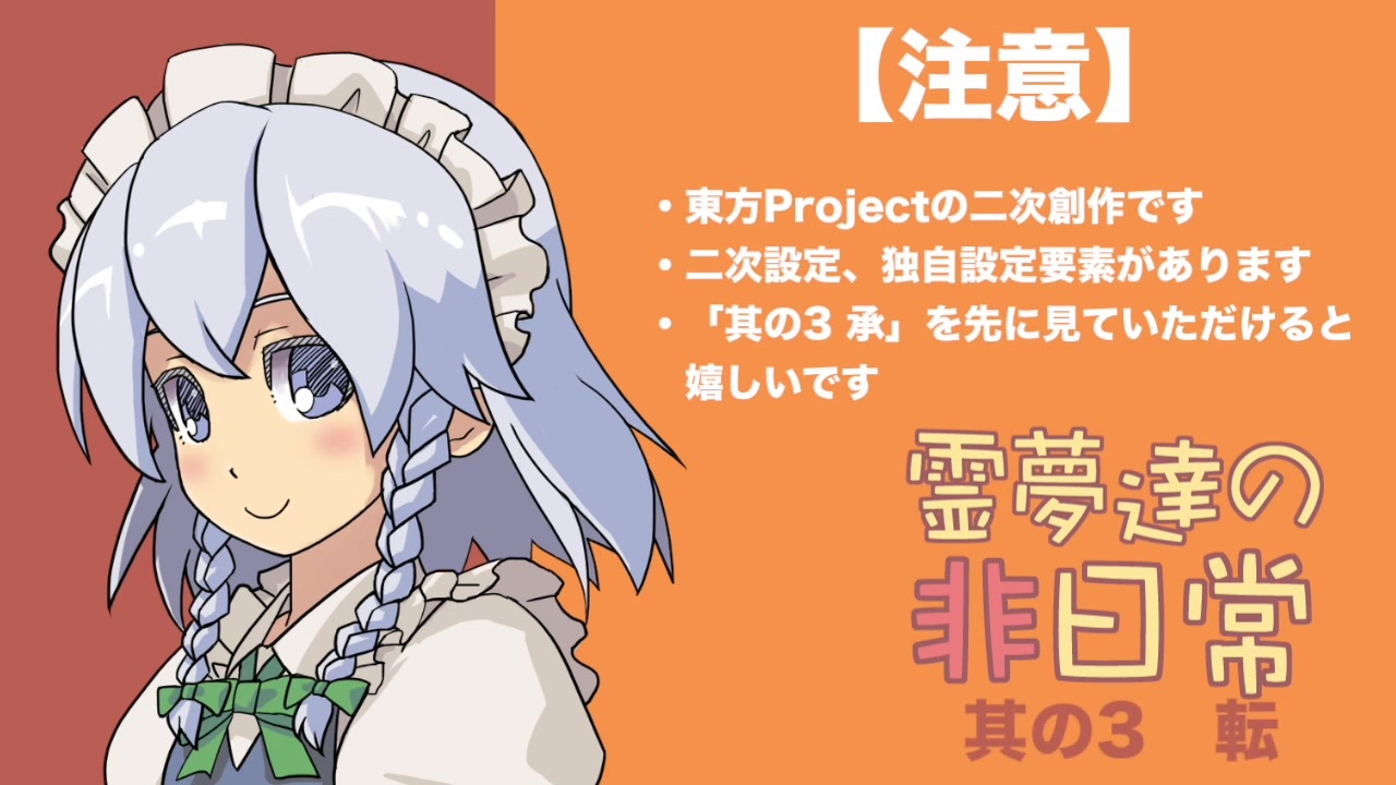 手書き動画です。<br>二次設定独自設定要素あります。其の3「転」。つまりは3−3。<br>遅くなりました。<br><br>音楽は一部<br><span style="color: #333333; font-size: 13px;">騒音のない世界: <a href="http://noiselessworld.net" target="_blank" rel="noopener nofollow">http://noiselessworld.net</a><br>様の楽曲を使わせていただきました。<br> フレア</span><br> 空を見上げれば<br><br><span style="color: #000000; font-size: 13px;">其の3「起」:</span><a href="https://www.nicovideo.jp/watch/sm34878740" class="watch">sm34878740</a><br><span style="color: #000000; font-size: 13px;">其の3「承」:</span><a href="https://www.nicovideo.jp/watch/sm34996206" class="watch">sm34996206</a><br><span style="color: #000000; font-size: 13px;">其の3「転」:本動画</span><br>其の3「結」:<a href="https://www.nicovideo.jp/watch/sm35392155" class="watch">sm35392155</a><br><br><br>東方自作マイリスト <a href="https://www.nicovideo.jp/mylist/60367441" target="_blank" rel="noopener">mylist/60367441</a><br>霊夢達の非日常のマイリスト <a href="https://www.nicovideo.jp/mylist/62917400" target="_blank" rel="noopener">mylist/62917400</a><br><br>反省会 :<a href="https://ch.nicovideo.jp/article/ar1775665" target="_blank" rel="noopener">ar1775665</a><br><br>追記:<br>再生、コメント、マイリストありがとうございます。とても嬉しいです!<br>広告もありがとうございます。とても嬉しいです!<br>これからも精進します!
