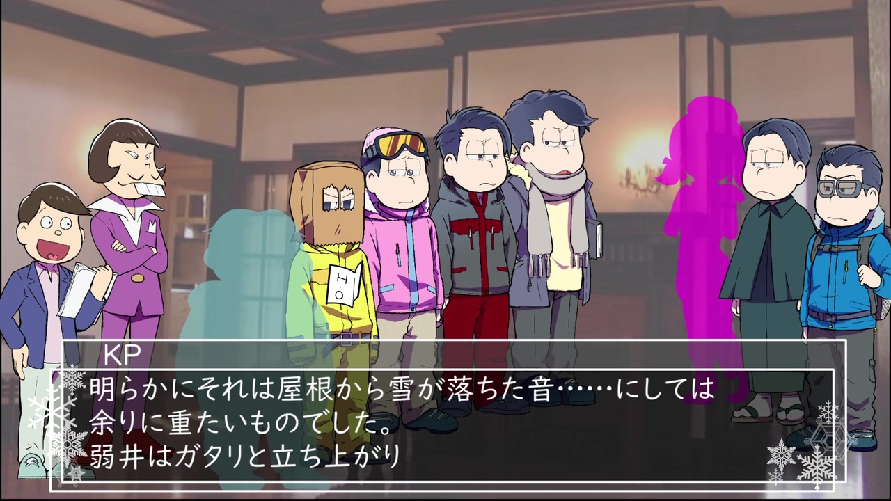 尚埜田+y「取り分け先を急ぐ旅でもなかったのだから、出来るだけ無難な道を行くべきだったのだ。」<br><br>Wizard of OZより御原様制作「雪山密室」<br>( <a href="https://www.pixiv.net/member.php?id=29245374" target="_blank" rel="noopener nofollow">https://www.pixiv.net/member.php?id=29245374</a> )<br>の改変シナリオで行ったセッションのリプレイ動画です。<br><br><strong>腐コメ・内容のネタバレにあたるコメントはご遠慮ください。</strong><br><br><span style="color: #000000; font-size: 13px;">ねこへのシリーズpart1集:(<a href="https://www.nicovideo.jp/mylist/65286829" target="_blank" rel="noopener">mylist/65286829</a>)</span><br>当シリーズ一覧:(<a href="https://www.nicovideo.jp/mylist/65286941" target="_blank" rel="noopener">mylist/65286941</a>)<br><br>(<a href="https://www.nicovideo.jp/watch/sm35035526" class="watch">sm35035526</a>)←part3 part5→(<a href="https://www.nicovideo.jp/watch/sm35472113" class="watch">sm35472113</a>)<br><br>※一部自分絵表現<br>※元ネタとは違う関係・設定含む<br>※お借りしたものはクレジット及びツリー記載<br>※キャラシ詳細はpart0にて<br><br><span style="color: #dcdcdc; font-size: 10px;">六つ子がニコニコユーザーとしてHNを使用し活動している<br>……という設定のCoCリプレイ動画です。<br>詳しくは過去シリーズ参照。<br><br>実際に行ったセッションの様子はこちら</span><br><span style="font-size: 10px;">( <a href="https://youtu.be/y0HWdgEMhM0" target="_blank" rel="noopener nofollow">https://youtu.be/y0HWdgEMhM0</a> )</span><br>