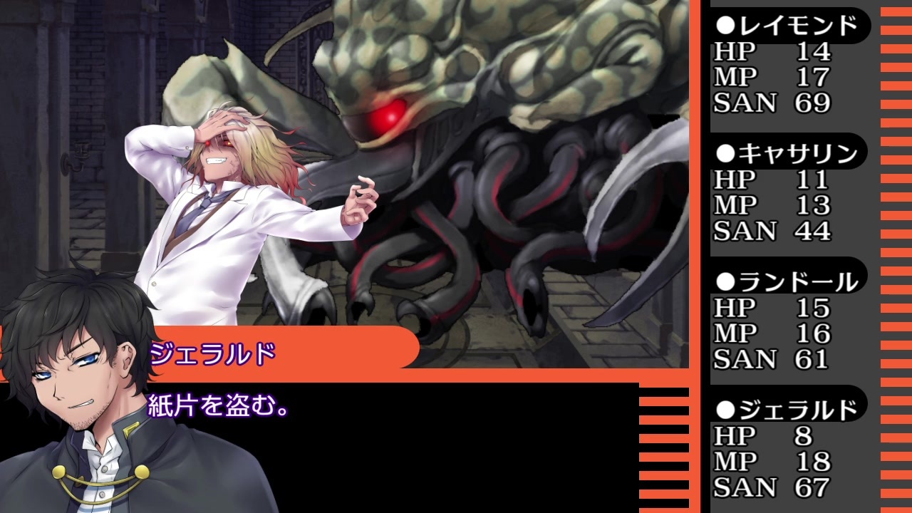 本作は、「 株式会社アークライト 」及び「株式会社KADOKAWA」が権利を有する『クトゥルフ神話TRPG』の二次創作物です。<br><br>Call of Cthulhu is copyright ©1981, 2015, 2019 by Chaosium Inc. ;all rights reserved. Arranged by Arclight Inc.<br>Call of Cthulhu is a registered trademark of Chaosium Inc.<br>PUBLISHED BY KADOKAWA CORPORATION 「クトゥルフ神話TRPG」<br><br>※当シナリオはシナリオ集「霧に煙る街並」に収録されています。<br><a href="https://colorcat.booth.pm/items/1656973" target="_blank" rel="noopener nofollow">https://colorcat.booth.pm/items/1656973</a><br><br>お付き合いいただき、有難うございました。<br>一応、解説回はそのうち作ろうかなと思います。<br><br>一部、対比的におかしいところもありますが。<br>あまりリアルに再現しすぎてもキャラ絵が見えなくなるかなーと思ったので、あんな感じでご容赦ください。<br><br>ヴィクトリア朝セッションです。<br>時代考証他間違っているところもあるかもしれませんが、大目に見ていただければ幸いです。<br>此方はキャンペーンの第三章ですので、先に第一章(<a href="https://www.nicovideo.jp/watch/sm35138839" class="watch">sm35138839</a>)第二章(<a href="https://www.nicovideo.jp/watch/sm35186065" class="watch">sm35186065</a>)をご試聴ください。<br><br>身内卓を動画化しています。<br>ハウスルールましましで色々緩いですが、ご容赦ください。<br><br>広告して下さる皆さん、いつもありがとうございます。<br>まとめてのお礼となりまして恐縮ですが、今後とも頑張ります。<br><br>[クトゥルフ動画一覧]<a href="https://www.nicovideo.jp/mylist/60110794" target="_blank" rel="noopener">mylist/60110794</a><br>[part1動画一覧]<a href="https://www.nicovideo.jp/mylist/60289921" target="_blank" rel="noopener">mylist/60289921</a><br>[ガスライトセッションマイリスト]<a href="https://www.nicovideo.jp/mylist/65566982" target="_blank" rel="noopener">mylist/65566982</a><br><br>[前]<a href="https://www.nicovideo.jp/watch/sm35274353" class="watch">sm35274353</a><br><span style="font-size: 13px;">[解説回]</span><a href="https://www.nicovideo.jp/watch/sm35278079" class="watch">sm35278079</a><br /><br>色猫卓ポータルサイト<br>→<a href="https://marchocias.xsrv.jp/colorcat/index.html" target="_blank" rel="noopener nofollow">https://marchocias.xsrv.jp/colorcat/index.html</a><br>動画で紹介しても良い支援絵は #いろねこあーと で!<br><br>ピッコマで小説連載開始しました!<br>魔族生まれの聖女様!? 著:黒猫ている<br><a href="https://piccoma.com/web/product/156938" target="_blank" rel="noopener nofollow">https://piccoma.com/web/product/156938</a>