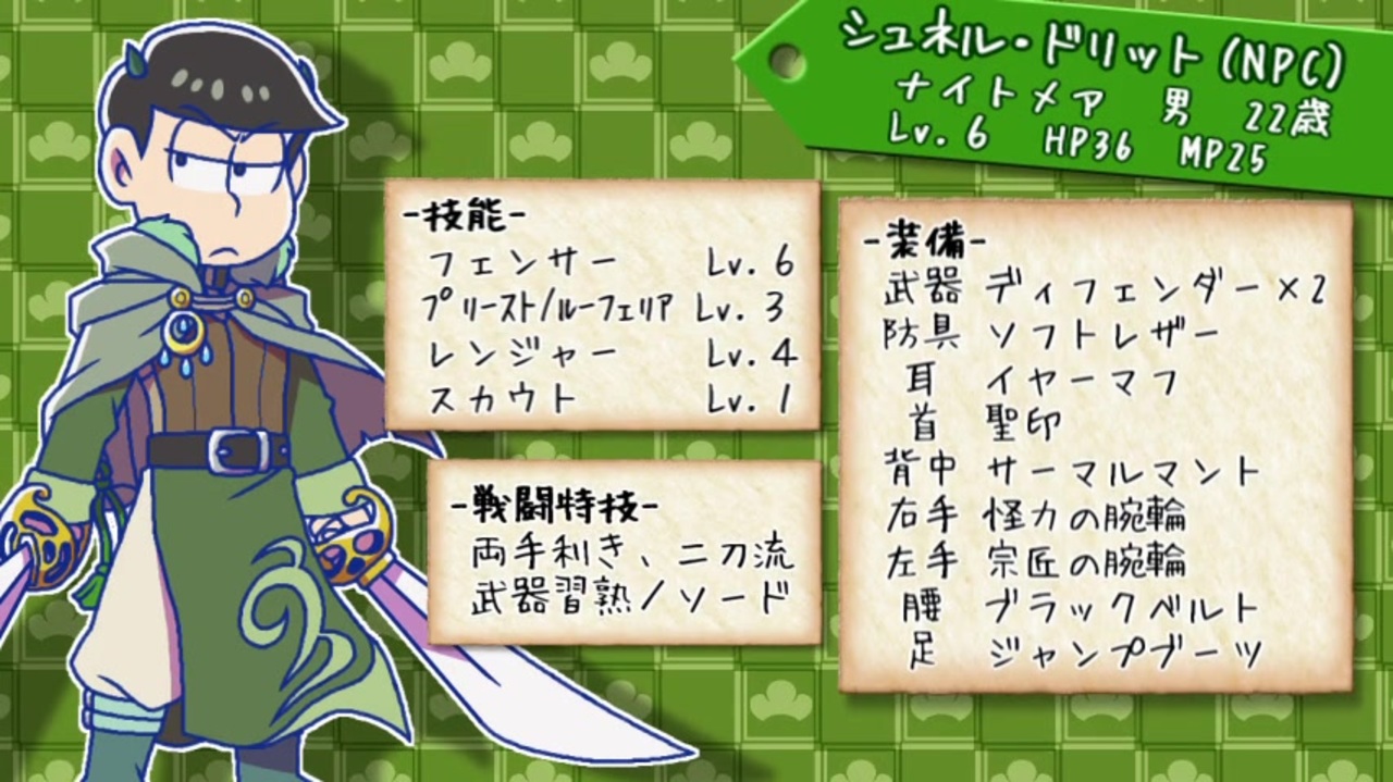 AviUtlさんの球体という機能を初めて使ってみましたが、これはいいものだ。<br>戦闘エフェクトの幅が広がります。<br><br>◇グッズショップ><a href="https://houndragon.booth.pm/" target="_blank" rel="noopener nofollow">https://houndragon.booth.pm/</a><br>◇マイリス><a href="https://www.nicovideo.jp/mylist/62624771" target="_blank" rel="noopener">mylist/62624771</a>(卓ゲ松)/<a href="https://www.nicovideo.jp/mylist/55901144" target="_blank" rel="noopener">mylist/55901144</a>(松実況)/<a href="https://www.nicovideo.jp/mylist/35673765" target="_blank" rel="noopener">mylist/35673765</a>(総合)<br><br>◆前回><a href="https://www.nicovideo.jp/watch/sm35173966" class="watch">sm35173966</a>/◆次回(コメ返)><a href="https://www.nicovideo.jp/watch/sm35385227" class="watch">sm35385227</a><br>◆part0><a href="https://www.nicovideo.jp/watch/sm33598879" class="watch">sm33598879</a><br>◆立ち絵配布><a href="https://www.nicovideo.jp/watch/sm28053083" class="watch">sm28053083</a>(転載・再配布禁止)<br><br>◇YouTube版><a href="https://youtu.be/9S5OwBZzT_0" target="_blank" rel="noopener nofollow">https://youtu.be/9S5OwBZzT_0</a><br><br>(追記)<span style="color: #000000; font-size: 13px;">mia様、夏樹様、野球マン様、シュネル兄さん親衛隊様、エアー様、春 紫苑様、サトきち様、ryo様、hachimitsu様、でこ松様、あやちゅん様、キオン様、ナナミ様、三日月 [mikage]様、りっつん様、愛瑠様、紅蓮乃様、みづき様、松cat様、翔。様、石っころ様、とあるひと様、秋初様、こめっと様、ハチ様、★様、RYU様、ハル様、赤居松征様、†静寂と孤独†様、壁|・)様、水無月ソラ様、空気様、ぺぷし様、るん@OP先生様、ふうまん様、リコロ様、シャル様、門松様、アン様、(゚д゚)様、マリ様、灰猫様、ソウル様、higure様、カルクスメア様、桃乃様、yutayuta様、Meg*様、00様、</span>亜弥月・フシギ様、スバル様、<span style="color: #000000; font-size: 13px;">宣伝ありがとうございます!</span>