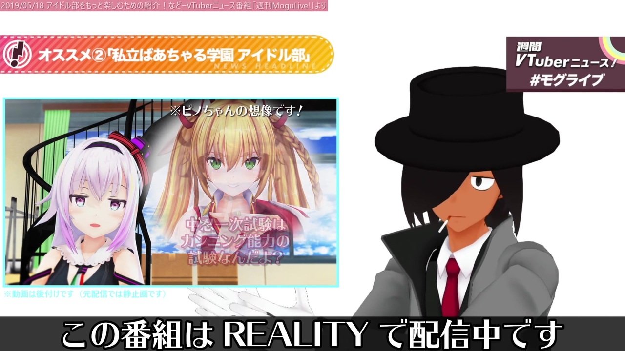 令和元年5月18日配信分です<br><br><strong>□元動画<br>■アイドル部をもっと楽しむための紹介!などーVTuberニュース番組「週刊MoguLive!」</strong><br> <a href="https://www.youtube.com/watch?v=GL4BCKCeWCk" target="_blank" rel="noopener nofollow">https://www.youtube.com/watch?v=GL4BCKCeWCk</a><br><strong>□関連リンク<br>■Twitter<br> 佐藤ホームズ</strong> <a href="https://twitter.com/satouholmes" target="_blank" rel="noopener nofollow">https://twitter.com/satouholmes</a><br> <strong>虹乃まほろ</strong> <a href="https://twitter.com/nijinomahoro" target="_blank" rel="noopener nofollow">https://twitter.com/nijinomahoro</a><br> <strong>たまごまご</strong> <a href="https://twitter.com/tamagomago" target="_blank" rel="noopener nofollow">https://twitter.com/tamagomago</a><br><span style="font-size: 10px;">■【前編】アイドル部 本気の学力テスト ~おバカtuberになるのは誰だ?!~<br> <a href="https://www.youtube.com/watch?v=kggBNGIX7cU" target="_blank" rel="noopener nofollow">https://www.youtube.com/watch?v=kggBNGIX7cU</a><br>■私立ばあちゃる学園アイドル部<br> <a href="https://www.youtube.com/playlist?list=PLf60tRnyWTZ_vGyiKlmGuBP4vsW0y-_JR" target="_blank" rel="noopener nofollow">https://www.youtube.com/playlist?list=PLf60tRnyWTZ_vGyiKlmGuBP4vsW0y-_JR</a><br>■【Vtuber】アイドル部の「箱推させ力」の話をしよう【佐藤ホームズの考察】<br> <a href="https://www.youtube.com/watch?v=sEMO22CztEU" target="_blank" rel="noopener nofollow">https://www.youtube.com/watch?v=sEMO22CztEU</a><br>■VTuber界の天然記念物、“ゆっくりハイペース”トーク――.LIVEアイドル部「ヤマト イオリ」の魅力とは<br> <a href="https://www.moguravr.com/vtuber-yamato-iori/" target="_blank" rel="noopener nofollow">https://www.moguravr.com/vtuber-yamato-iori/</a><br>■VTuber界のマルチタスク雀士「夜桜たま」の魅力とは?ひとり四面打ち麻雀+実況解説+コメント拾いまで!?<br> <a href="https://www.moguravr.com/vtuber-yozakuratama/" target="_blank" rel="noopener nofollow">https://www.moguravr.com/vtuber-yozakuratama/</a><br>■VTuber界の“虫愛づる姫君” 生き物大好きお嬢様「カルロ・ピノ」が持つ、ありのままの魅力<br> <a href="https://www.moguravr.com/vtuber-carro-pino/" target="_blank" rel="noopener nofollow">https://www.moguravr.com/vtuber-carro-pino/</a></span>