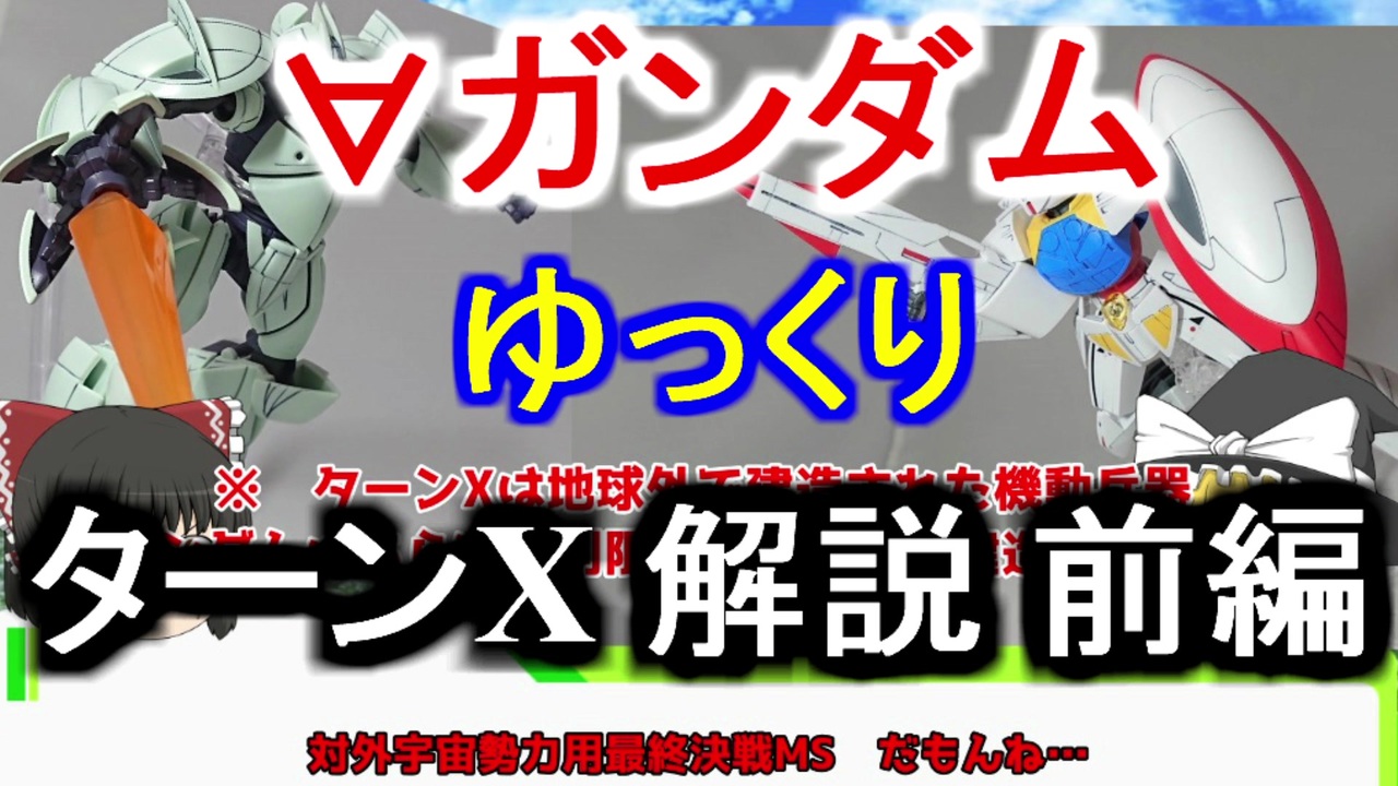 ゆっくり解説動画をご覧頂きありがとうございます<br><br>第7回 ターンX になりますので温かい目でご覧ください<br><br>前→<a href="https://www.nicovideo.jp/watch/sm35291993" class="watch">sm35291993</a> 次→<a href="https://www.nicovideo.jp/watch/sm35409062" class="watch">sm35409062</a><br><br>マイリスト→<a href="https://www.nicovideo.jp/mylist/64941178" target="_blank" rel="noopener">mylist/64941178</a><br><br>Gのレコンギスタ MS解説→<a href="https://www.nicovideo.jp/mylist/64330501" target="_blank" rel="noopener">mylist/64330501</a><br><br>G-SAVIOUR MS解説→<a href="https://www.nicovideo.jp/mylist/59454744" target="_blank" rel="noopener">mylist/59454744</a><br><br>機動戦士クロスボーンガンダム MS解説→<a href="https://www.nicovideo.jp/mylist/62932906" target="_blank" rel="noopener">mylist/62932906</a><br><br>機動戦士Vガンダム MS解説→<a href="https://www.nicovideo.jp/mylist/63385535" target="_blank" rel="noopener">mylist/63385535</a> <br><br>機動戦士ガンダムF91 MS解説→<a href="https://www.nicovideo.jp/mylist/61812408" target="_blank" rel="noopener">mylist/61812408</a> <br><br>今まで投稿した動画→<a href="https://www.nicovideo.jp/mylist/28583653" target="_blank" rel="noopener">mylist/28583653</a><br><br>youtubeチャンネル<br>シュウ部屋ちゃんねる で検索!<br><br>沢山の宣伝有難う御座います。宣伝者様一覧 <a href="https://ch.nicovideo.jp/article/ar1787780" target="_blank" rel="noopener">ar1787780</a>