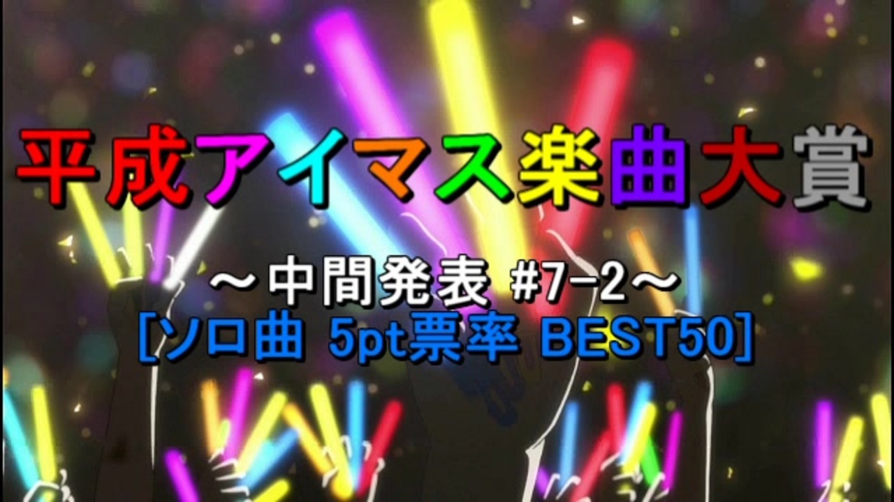 <span style="color: #0000ff; font-size: 13px;">平成終了時点に音源の存在</span>するアイマス関連の楽曲(<span style="color: #6aa84f; font-size: 13px;">計1191曲</span>)を対象にした人気投票企画の<br>中間発表7回目(その2)です。<span style="color: #ff00ff;">ソロ</span><span style="color: #ff00ff; font-size: 13px;">曲部門における1000名の参加者</span>の結果から算出した<br><span style="color: #00ffff;"><strong>5pt票率のBEST50</strong></span>を発表します。<br><br><span style="font-size: 16px;"><strong>※5pt票率(ユニット曲編):<a href="https://www.nicovideo.jp/watch/sm35459909" class="watch">sm35459909</a> / 5pt票率(カバー曲編):<a href="https://www.nicovideo.jp/watch/sm35460179" class="watch">sm35460179</a></strong></span><br><br><span style="color: #9900ff; font-size: 24px;">★投票対象一覧</span><span style="font-size: 24px;">:<a href="https://ch.nicovideo.jp/article/ar1747272" target="_blank" rel="noopener">ar1747272</a></span><br><br><span style="color: #ff0000; font-size: 18px;"><strong>※最終結果:<a href="https://www.nicovideo.jp/series/77442" target="_blank" rel="noopener">series/77442</a></strong></span><br><br>○レギュレーション説明:<a href="https://www.nicovideo.jp/watch/sm35054161" class="watch">sm35054161</a><br>○中間発表6回目(ユニット曲部門):<a href="https://www.nicovideo.jp/watch/sm35396412" class="watch">sm35396412</a><br><br><span style="color: #262626; font-size: 13px;">●『アイマス楽曲ランキングシリーズ』:<a href="https://www.nicovideo.jp/mylist/57911966" target="_blank" rel="noopener">mylist/57911966</a></span><br>●『THE IDOLM@STER Song Collection』:<a href="https://www.nicovideo.jp/mylist/61493969" target="_blank" rel="noopener">mylist/61493969</a>