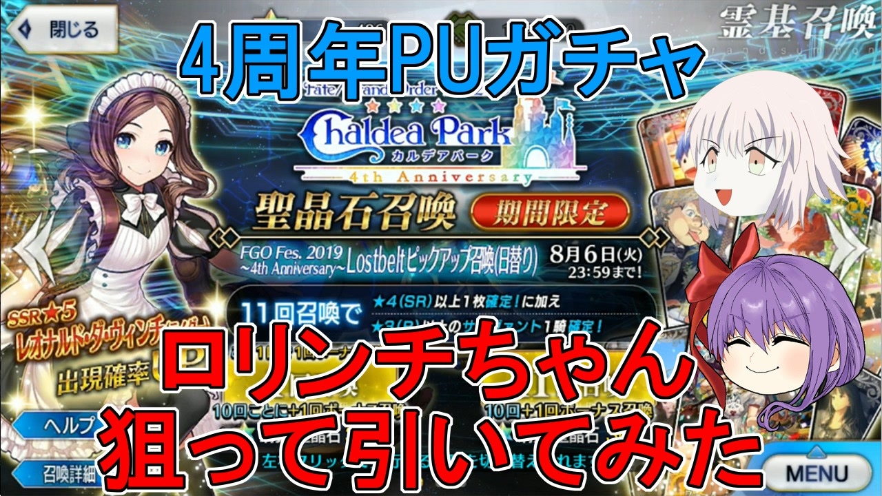 結局ロリンチちゃん狙うことにしました。<br><br>動画についてリクエスト等ありましたらコメントやTwitter等にご連絡頂ければ可能な限り検討致します。<br>御用の際には下記アドレスまで宜しくお願いします。<br>連絡先メールアドレス → cecimesfr@gmail.com<br>Twitter → <a href="https://twitter.com/Ceci_startnow" target="_blank" rel="noopener nofollow">https://twitter.com/Ceci_startnow</a><br>今回の動画の音楽は「魔王魂様」「甘茶の音楽工房様」からお借りしています<br><br><span style="color: #111111;">前回の動画→</span><a href="https://www.nicovideo.jp/watch/sm35496707" class="watch">sm35496707</a><span style="color: #111111;"> 次回の動画→</span><a href="https://www.nicovideo.jp/watch/sm35501824" class="watch">sm35501824</a><br><u><a href="https://www.nicovideo.jp/mylist/60420393" target="_blank" rel="noopener">mylist/60420393</a></u><br><br>↓邪ンヌ宝具5チャレンジ↓<br><u><a href="https://www.nicovideo.jp/mylist/65709199" target="_blank" rel="noopener">mylist/65709199</a></u>