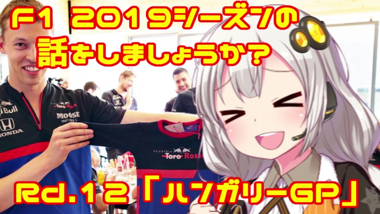 <br><br>「クビアト選手のお子さんの名前がペネロペちゃんに決まりましたよ。」by 紲星あかり<br><br>おはこんばんちは、紲星あかりです。<br>この動画は、F1 2019シーズンをダイジェストでお送りしています。<br>第12回目は第12戦・ハンガリーGPです。<br>大混乱となった前回のドイツGPで今季2勝目を獲得したフェルスタッペン。<br>今回、レッドブルに有利なハンガロリンクで連勝することができたのでしょうか?<br><br><span style="color: red;">(ご注意)この動画の情報は真実とは限りません。また、誤字・脱字が含まれる場合があります。ご了承ください。</span><br><br><br>前<span style="color: #000000; font-size: 13px;">→第11戦・ドイツGP </span><a href="https://www.nicovideo.jp/watch/sm35471092" class="watch">sm35471092</a><br>次→第13戦・ベルギーGP <a href="https://www.nicovideo.jp/watch/sm35634545" class="watch">sm35634545</a><br><br>F12019シーズンの話をしましょうか?マイリスト→<a href="https://www.nicovideo.jp/mylist/64678414" target="_blank" rel="noopener">mylist/64678414</a><br><br>うp主のF1動画シリーズ<br>F12018シーズンの話をしましょうか?マイリスト<span style="color: #000000; font-size: 13px;">→</span><a href="https://www.nicovideo.jp/mylist/61514606" target="_blank" rel="noopener">mylist/61514606</a><br>F1の話をしましょうか?マイリスト→<a href="https://www.nicovideo.jp/mylist/40499353" target="_blank" rel="noopener">mylist/40499353</a><br>F1の話をしましょうか?OPフルバージョン→<a href="https://www.nicovideo.jp/mylist/59030210" target="_blank" rel="noopener">mylist/59030210</a><br>F1 CM集→<a href="https://www.nicovideo.jp/mylist/57297507" target="_blank" rel="noopener">mylist/57297507</a><br><br>