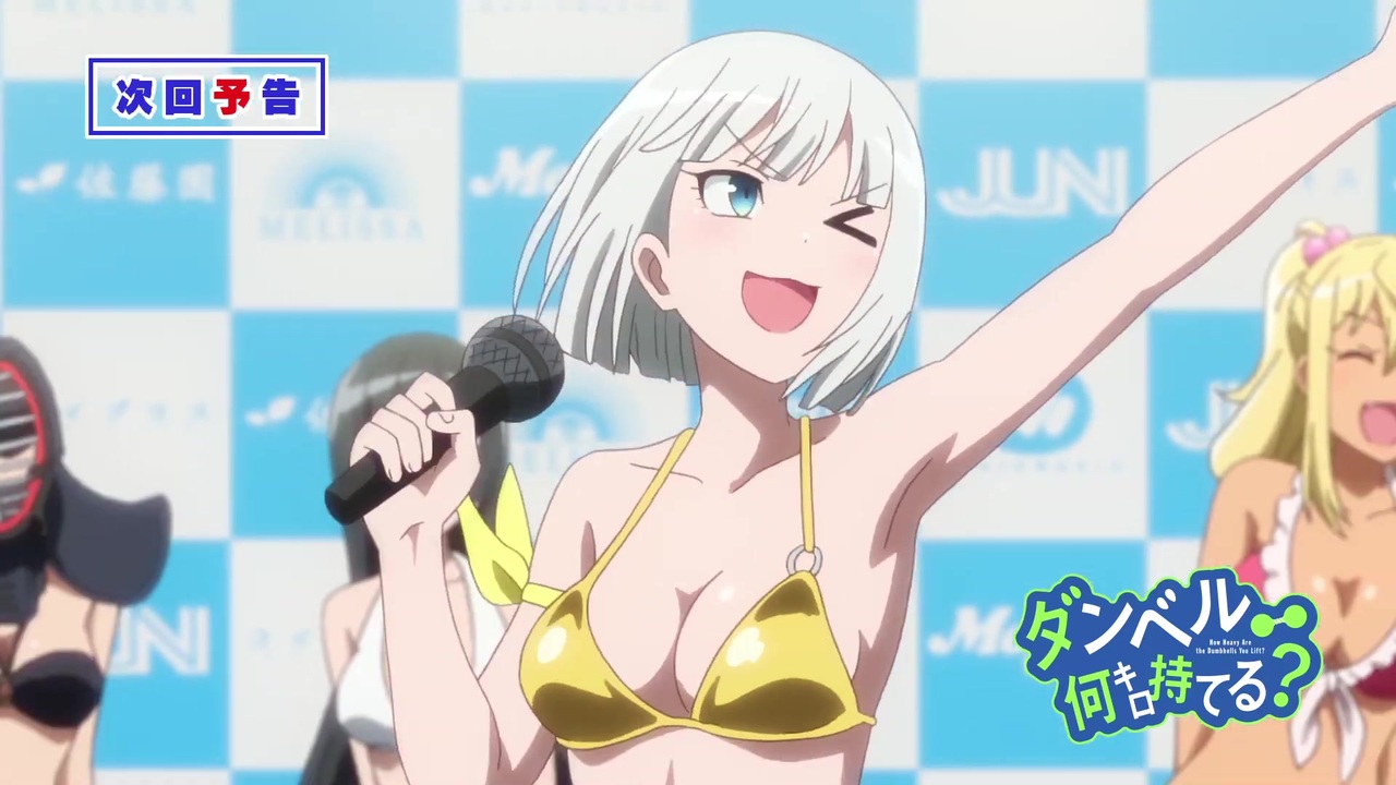 第7話「アイドルになりたい?」(2019.8.14 ON AIR)<br>里美の秘密に気づいたジーナ。実はアイドルフェチだったジーナは、秘密を黙っていることを条件に里美に協力を要請。ひびきたちも誘い、アイドルオーディションに参加する。果たしてひびきたちのアイドルユニットは、みごとデビューできるのだろうか。<br><br><br><br>脚本:志茂文彦<br>絵コンテ:野呂純恵<br>演出:野呂純恵<br>作画監督:平山寛菜/立口徳孝/天﨑まなむ<br><br>TVアニメ『ダンベル何キロ持てる?』<br>【放送情報】<br>AT-X :毎週水曜日22時30分~<br>TOKYO MX :毎週水曜日23時30分~<br>テレビ愛知 :毎週水曜日26時05分~<br>KBS京都 :毎週水曜日24時00分~<br>サンテレビ :7毎週水曜日24時00分~<br>BS11 :毎週木曜日24時30分~<br>※都合により放送日時は変更の可能性があります。予めご了承ください。<br><br>【STAFF】<br>原作:サンドロビッチ・ヤバ子 作画:MAAM (小学館「マンガワン」連載中)<br>監督:山﨑みつえ<br>シリーズ構成・脚本:志茂文彦<br>キャラクターデザイン:菊池愛<br>プロップデザイン:中島千明・松本恵<br>美術監督:杉浦美穂<br>色彩設計:真壁源太<br>撮影監督:伊藤邦彦<br>イメージグラフィックデザイン:桒野貴文<br>編集:武宮むつみ<br>音楽:橋本由香利<br>音響効果:白石唯果<br>キャスティングマネージャー:谷村誠<br>アニメーション制作:動画工房<br>製作:シルバーマンジム<br><br>【CAST】<br>紗倉ひびき:ファイルーズあい<br>奏流院朱美:雨宮 天<br>街雄鳴造:石川界人<br>上原彩也香:石上静香<br>ジーナ・ボイド:東山奈央<br>立花里美:堀江由衣<br>ナレーション:玄田哲章<br><br>