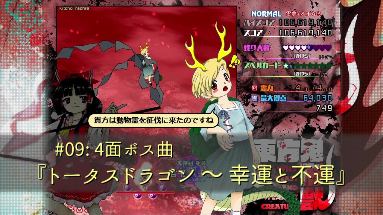 東方鬼形獣の全BGM集です。各曲1ループにしてテンポよく聴けるようにしました(半分自分用)。<br>道中曲愛好家ですが、今回は1面ボス曲、4面ボス曲、6面道中曲あたりが特に気に入ってて、5面ボス曲、Exボス曲あたりもなかなか好きです。通して聴いてみると3面道中の平和感というか、休息感がすごい…。<br><span style="color: #000000;">【紅-鬼】(かなり渋い)東方名曲メドレー→</span><a href="https://www.nicovideo.jp/watch/sm35531406" class="watch">sm35531406</a><br><span style="color: #000000; font-size: 13px;"><strong>---------------------------------------------------------------------------------</strong></span><br><span style="font-size: 13px;"><strong> </strong></span><strong> 【曲名リスト】 </strong><span style="font-size: 10px;"><strong>※投稿者コメントでも各曲に飛べます</strong></span><br>タイトル:物言わぬ獣の霊 (<a href="#" class="seekTime" data-seekTime="0:00" onclick="seekNicoPlayer('#0:00'); return false;">#0:00</a>)<br>1面道中:地蔵だけが知る哀嘆 (<a href="#" class="seekTime" data-seekTime="1:30" onclick="seekNicoPlayer('#1:30'); return false;">#1:30</a>)<br>1面ボス:ジェリーストーン (<a href="#" class="seekTime" data-seekTime="3:51" onclick="seekNicoPlayer('#3:51'); return false;">#3:51</a>)<br>2面道中:ロストリバー (<a href="#" class="seekTime" data-seekTime="5:22" onclick="seekNicoPlayer('#5:22'); return false;">#5:22</a>)<br>2面ボス:石の赤子と水中の牛 (<a href="#" class="seekTime" data-seekTime="7:38" onclick="seekNicoPlayer('#7:38'); return false;">#7:38</a>)<br>3面道中:不朽の曼珠沙華 (<a href="#" class="seekTime" data-seekTime="9:35" onclick="seekNicoPlayer('#9:35'); return false;">#9:35</a>)<br>3面ボス:セラフィックチキン (<a href="#" class="seekTime" data-seekTime="12:35" onclick="seekNicoPlayer('#12:35'); return false;">#12:35</a>)<br>4面道中:アンロケイテッドヘル (<a href="#" class="seekTime" data-seekTime="15:01" onclick="seekNicoPlayer('#15:01'); return false;">#15:01</a>)<br>4面ボス:トータスドラゴン ~幸運と不運 (<a href="#" class="seekTime" data-seekTime="18:19" onclick="seekNicoPlayer('#18:19'); return false;">#18:19</a>)<br>5面道中:ビーストメトロポリス (<a href="#" class="seekTime" data-seekTime="21:15" onclick="seekNicoPlayer('#21:15'); return false;">#21:15</a>)<br>5面ボス:セラミックスの杖刀人 (<a href="#" class="seekTime" data-seekTime="23:57" onclick="seekNicoPlayer('#23:57'); return false;">#23:57</a>)<br>6面道中:エレクトリックヘリテージ (<a href="#" class="seekTime" data-seekTime="26:21" onclick="seekNicoPlayer('#26:21'); return false;">#26:21</a>)<br>6面ボス:偶像に世界を委ねて ~Idoratrize world (<a href="#" class="seekTime" data-seekTime="28:29" onclick="seekNicoPlayer('#28:29'); return false;">#28:29</a>)<br>Extra道中:輝かしき弱肉強食の掟 (<a href="#" class="seekTime" data-seekTime="32:35" onclick="seekNicoPlayer('#32:35'); return false;">#32:35</a>)<br>Extraボス:聖徳太子のペガサス ~Dark Pegasus (<a href="#" class="seekTime" data-seekTime="35:37" onclick="seekNicoPlayer('#35:37'); return false;">#35:37</a>)<br>エンディング:畜生達の休息 (<a href="#" class="seekTime" data-seekTime="39:35" onclick="seekNicoPlayer('#39:35'); return false;">#39:35</a>)<br>スタッフロール:地下からの帰還 (<a href="#" class="seekTime" data-seekTime="40:43" onclick="seekNicoPlayer('#40:43'); return false;">#40:43</a>)<br><span style="font-size: 13px;"><strong>---------------------------------------------------------------------------------</strong></span><br>