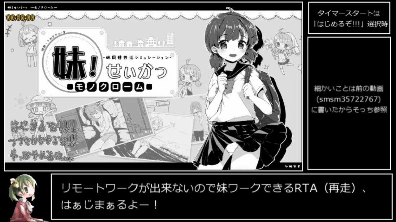 リモートワークが出来ないので初妹ワークです<br><br>ver2.0<br><br>~計測範囲~<br>スタート:はじめるぞ!!!選択時<br>ストップ:HAPPY ENDが表示された瞬間<br><br>前回 <a href="https://www.nicovideo.jp/watch/sm35722767" class="watch">sm35722767</a> 次回 <a href="https://www.nicovideo.jp/watch/sm36913174" class="watch">sm36913174</a><br><br><a href="https://www.dlsite.com/maniax/work/=/product_id/RJ258445.html" target="_blank" rel="noopener nofollow">https://www.dlsite.com/maniax/work/=/product_id/RJ258445.html</a><br>(18禁注意)