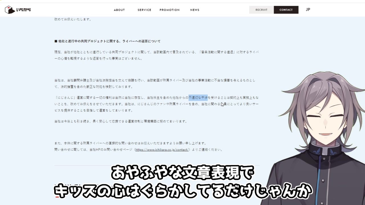 YouTubeにあったコメントが共感できたので引用<br><br><span style="color: #030303; font-size: 14px;">当社所属ライバーのデジタルボイス売上については、販売プラットフォームから当社が受領する金額(売上からプラットフォーム手数料を除いたもの)のうち、その50%をライバーへ報酬として支払っております。<br>→ プラットフォームが変われば本人の手取りは変わります。<br>ーーーー<br>また、将来的な経営判断としてボイス販売を実施するプラットフォームが変更となった場合でもこの条件に変動はないという事実を、当社所属ライバーに対して “ライバー内の代表者を通じて” ”(ライバー任意参加の)ビデオ会議” の2つの方法によって5月18日〜23日の間に周知しています。<br>→プラットフォーム変えるために話し合ってます。<br><br>ーーーー<br>なお、当社は現在使用しているグッズ等の販売プラットフォームに関して様々な検討を行っていることは事実ですが、現在までに決定した事実はございません。この点に関しては、当社内及びライバーとの話合いを踏まえて、ファンや関係者の皆様にお伝えすべき事項が決まった際に、改めてお伝えいたします。<br>→まだ協議中ですが、BOOTHを続けていくつもりはありません<br>ーーーーー<br>当社は、当社顧問弁護士及び当社法務担当を交えて協議を行い、当該動画が所属ライバー及び当社の事業活動に不当な損害を与えるものとして、法的措置を含めた厳正な対処を検討しております。<br>→企業が法的処置を真剣に持ち出す場合は「検討」じゃなく「進める」と書く<br>ーーーー<br>「にじさんじ」運営に関する一切の権利は当然に当社に存在し、当社株主を含めた他社からの不適切な干渉を受けることは契約上も実務上もないことを、改めてお伝えをさせていただきます。当社は、にじさんじのファンや所属ライバーを含め、当社に関わる全員にとってより良いサービスを提供することを目指して運営をしてまいります。<br>→「企業運営にとって適切」な干渉は今までも受けてきた<br>企業的に見るとライバーへのマージンを減らし、会社の収益をあげるような指示は不適切な干渉ではないと説明できる</span><br><br>鳴神かわヨリスト作りました。 <a href="https://www.nicovideo.jp/mylist/67698095" target="_blank" rel="noopener">mylist/67698095</a><br><br><br><br>鳴神裁:<a href="https://twitter.com/narukami_sabaki" target="_blank" rel="noopener nofollow">https://twitter.com/narukami_sabaki</a><br>元動画:<a href="https://www.youtube.com/watch?v=K9cQm53ZJh0" target="_blank" rel="noopener nofollow">https://www.youtube.com/watch?v=K9cQm53ZJh0</a><br>
