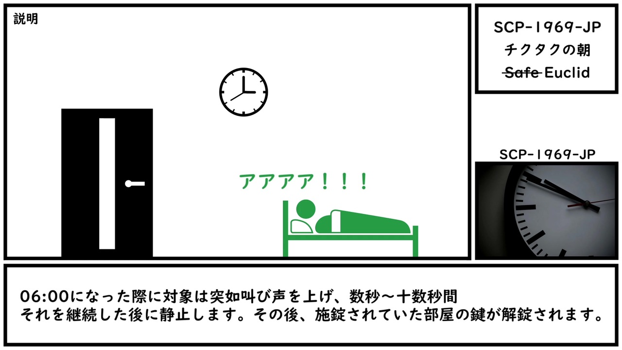 ん、もう朝か…<br><br>本家記事 <a href="http://scp-jp.wikidot.com/scp-1969-jp" target="_blank" rel="noopener nofollow">http://scp-jp.wikidot.com/scp-1969-jp</a><br>作者 kotarou611<br>SCP財団 <a href="http://scp-jp.wikidot.com" target="_blank" rel="noopener nofollow">http://scp-jp.wikidot.com</a><br>過去の動画はこちら <a href="https://www.nicovideo.jp/mylist/67620202" target="_blank" rel="noopener">mylist/67620202</a><br>CC-BY-SA 3.0<br><br>