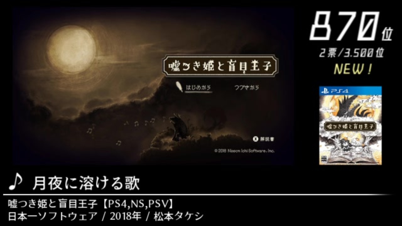 コイ→sora→クロラ<br><br><br><br>■諸般のお知らせ<br><br><br>・本動画は、「第13回みんなで決めるゲーム音楽ベスト100」開票結果の1位~980位までの動画化です<br><br> ※開票結果リンク先:<a href="https://w.atwiki.jp/gamemusicbest100/pages/8349.html" target="_blank" rel="noopener nofollow">https://w.atwiki.jp/gamemusicbest100/pages/8349.html</a><br><br> ※企画についての仔細はブログにて<br> (今回もスクショを視聴者の方々より募集しております。投稿にあたっての要項や投稿先URLもこちらに記載しております)<br><br>⇒第13回動画用ブログ:<a href="https://bit.ly/3rxGH1T" target="_blank" rel="noopener nofollow">https://bit.ly/3rxGH1T</a> (<a href="https://ch.nicovideo.jp/article/ar1958036" target="_blank" rel="noopener">ar1958036</a> からの移転先)<br><br><br><br>・全体としてネタバレだらけです。注意して下さい<br><br><br>・曲紹介の際に記載している年表記は「曲の発表年」です(基本的には出典ゲームの発売年ですが、DLCなどの都合で違ってくる場合がありますので、その際は動画内にて補足します)<br><br><br>・<a href="#" class="seekTime" data-seekTime="14:47" onclick="seekNicoPlayer('#14:47'); return false;">#14:47</a>~、<a href="#" class="seekTime" data-seekTime="31:26" onclick="seekNicoPlayer('#31:26'); return false;">#31:26</a>~、<a href="#" class="seekTime" data-seekTime="42:56" onclick="seekNicoPlayer('#42:56'); return false;">#42:56</a>~:<br>収録時間が5分以上の曲です<br><br><br>・<a href="#" class="seekTime" data-seekTime="36:24" onclick="seekNicoPlayer('#36:24'); return false;">#36:24</a>~:<br>音が左右に振れまくります (何のこっちゃと思われるかもしれませんが文字通りです)。<br>苦手な方は動画の音量に細心の注意を払ってください<br><br><br>Part4→<a href="https://www.nicovideo.jp/watch/sm38114095" class="watch">sm38114095</a> Part6→<a href="https://www.nicovideo.jp/watch/sm38319317" class="watch">sm38319317</a> マイリスト:<a href="https://www.nicovideo.jp/mylist/69791041" target="_blank" rel="noopener">mylist/69791041</a><br><br>※ちなみに、毎Part の動画冒頭で流しているBGMは、後日、別動画にて改めて紹介する予定です(スクショも受け付けますので、興味ある方は投稿フォームから)