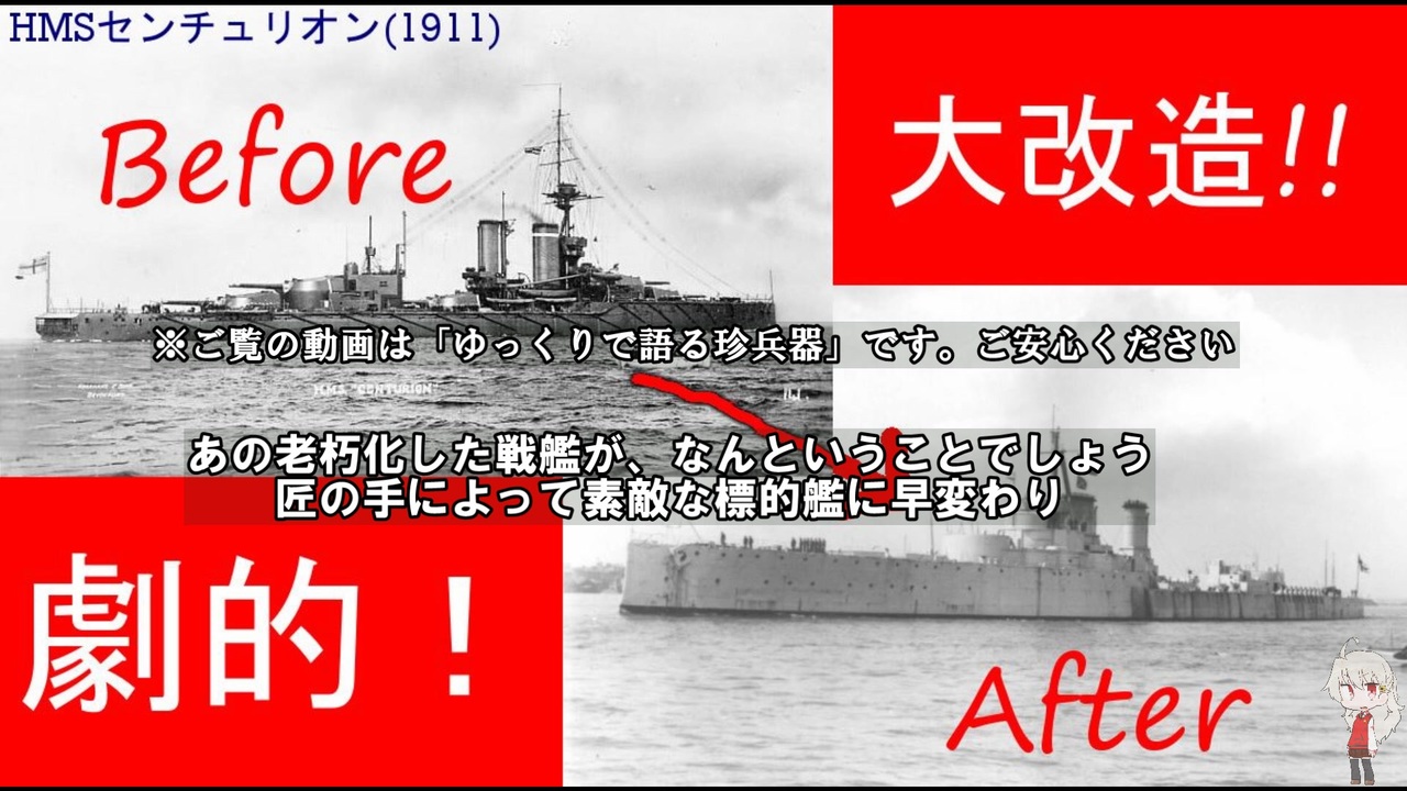 今回は珍しい来歴の戦艦のご紹介。番外編にしようかと思ったけど、何度も改造されながら英国海軍に奉仕し続けた古兵のことを少しでも多くの人に知ってもらいたくて本編で取り扱ってみたよ。<br>なお所々にある「KGV」は「キング・ジョージ五世」の略です。念の為<br><br>いただいた支援絵<br><a href="https://twitter.com/eldian18850378/status/1360546761165729797?s=21" target="_blank" rel="noopener nofollow">https://twitter.com/eldian18850378/status/1360546761165729797?s=21</a><br><br>・参考文献<br>多いのでこちらを<br><a href="https://teambtrb.com/?p=1842" target="_blank" rel="noopener nofollow">https://teambtrb.com/?p=1842</a><br><br>・BGM<br>OP:<a href="https://freepd.com/" target="_blank" rel="noopener nofollow">https://freepd.com/</a> より"And Just Like That"<br>"Pardon The Glove"(いつもの)<br>"A room with a view"<br>"After My Laughter Came Tears"(いつもの)<br><br>グッズ販売やってます→<a href="https://straw2nd.booth.pm/" target="_blank" rel="noopener nofollow">https://straw2nd.booth.pm/</a><br>Twitter→@straw2nd(<a href="https://twitter.com/straw2nd" target="_blank" rel="noopener nofollow">https://twitter.com/straw2nd</a> )<br>絵師様(<a href="https://www.nicovideo.jp/user/18488128" target="_blank" rel="noopener">user/18488128</a>)Twitter→@myonshiso(<a href="https://twitter.com/myonshiso" target="_blank" rel="noopener nofollow">https://twitter.com/myonshiso</a> )<br>お題箱(兵器のリクエストはここへ)→<a href="http://odaibako.net/u/straw2nd" target="_blank" rel="noopener nofollow">http://odaibako.net/u/straw2nd</a><br>サークルHP(ブログでも兵器解説してるよ→<a href="http://teambtrb.com/" target="_blank" rel="noopener nofollow">http://teambtrb.com/</a><br>旧珍兵器リスト(シリーズ)→<a href="https://www.nicovideo.jp/series/40593" target="_blank" rel="noopener">series/40593</a><br>新珍兵器リスト→<a href="https://www.nicovideo.jp/mylist/68497286" target="_blank" rel="noopener">mylist/68497286</a><br>新珍兵器シリーズ→<a href="https://www.nicovideo.jp/series/134646" target="_blank" rel="noopener">series/134646</a><br>まとめ→<a href="https://www.nicovideo.jp/mylist/54248344" target="_blank" rel="noopener">mylist/54248344</a>