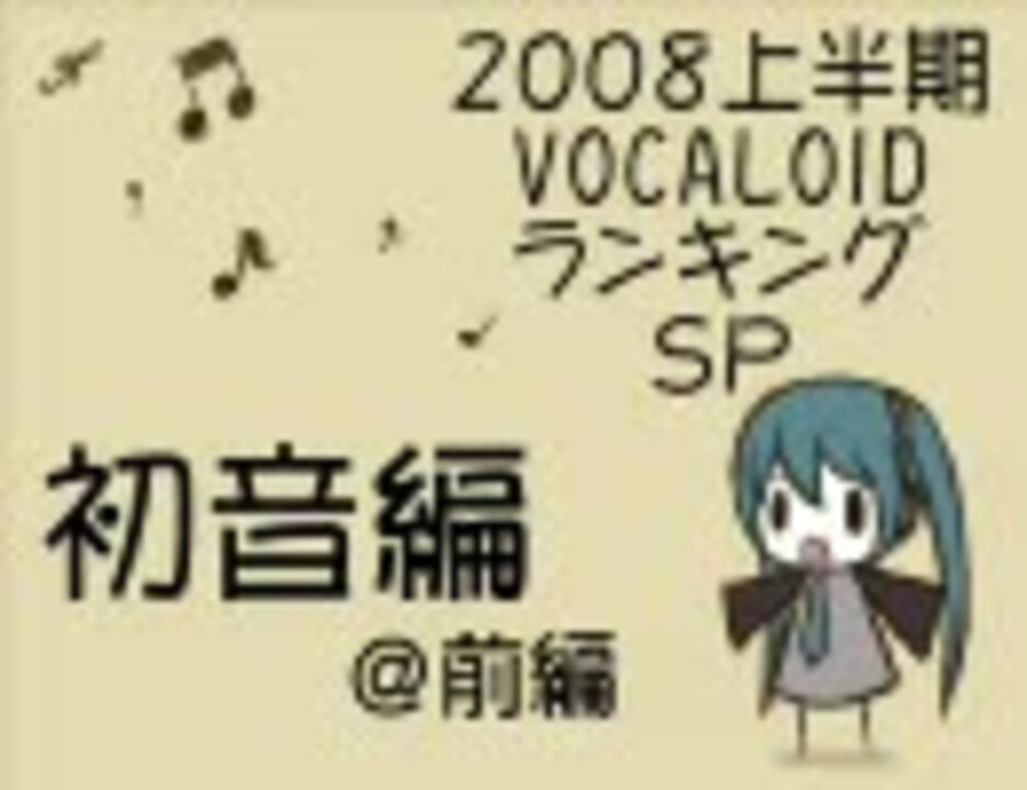 ■集計対象:2007/12/24~2008/6/23投稿の初音ミク使用動画動画<br />■集計方法:2008/7/1 0時のマイリスト数<br />■その他詳細は動画でご確認ください<br />■プレイリスト:<a href="https://www.nicovideo.jp/mylist/7404626" target="_blank" rel="noopener">mylist/7404626</a>(1位~30位)<br />■新曲SP KAITO編:<a href="https://www.nicovideo.jp/watch/sm3858386" class="watch">sm3858386</a> 鏡音編:<a href="https://www.nicovideo.jp/watch/sm3858389" class="watch">sm3858389</a> MEIKO編:<a href="https://www.nicovideo.jp/watch/sm3860192" class="watch">sm3860192</a><br /> 初音編(後編):<a href="https://www.nicovideo.jp/watch/sm3858459" class="watch">sm3858459</a> 複数・海外編:<a href="https://www.nicovideo.jp/watch/sm3858440" class="watch">sm3858440</a> PV・MMD編:<a href="https://www.nicovideo.jp/watch/sm3858437" class="watch">sm3858437</a><br />■海外組専用のランキングもできました→<a href="https://www.nicovideo.jp/watch/sm3931337" class="watch">sm3931337</a><br />■スクリプトで次の新曲SPに飛びます 次:初音編(後編)<br />