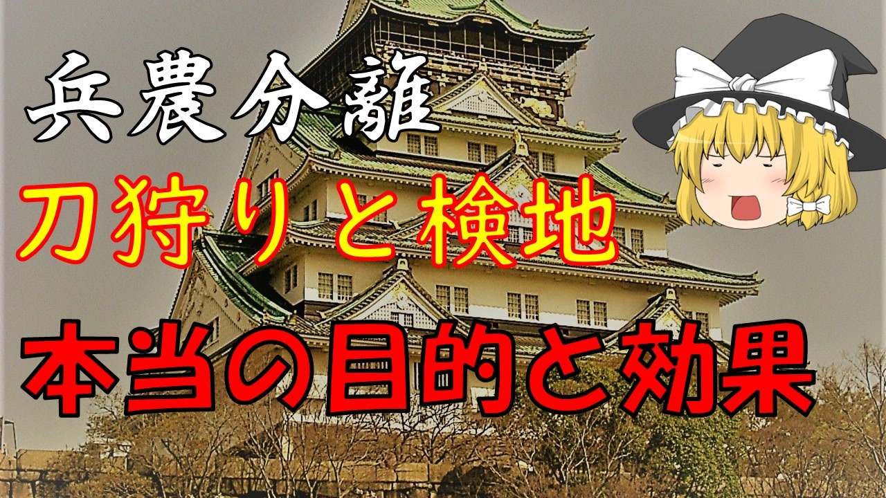 前回⇒<a href="https://www.nicovideo.jp/watch/sm38453156" class="watch">sm38453156</a><br>次回⇒<a href="https://www.nicovideo.jp/watch/sm38846689" class="watch">sm38846689</a><br><br><span style="color: #000000; font-size: 14px;">Twitter→</span><span style="color: #000000; font-size: 13px;"><a href="https://twitter.com/ootaushiichi" target="_blank" rel="noopener nofollow">https://twitter.com/ootaushiichi</a></span><br>信長解説シリーズ⇒<a href="https://www.nicovideo.jp/series/83634" target="_blank" rel="noopener">series/83634</a><br>番外編シリーズ⇒<a href="https://www.nicovideo.jp/series/107537" target="_blank" rel="noopener">series/107537</a><br><br><br>兵農分離編の第3回目、検地と刀狩りについてです。<br>教科書にも載り、兵農分離の要素として挙げられる検地と刀狩りですが…<br>果たしてこれをきっかけに兵農分離が進んだのか?<br>という話です<br><br>主要参考文献<br><br>朝尾直弘『日本の近世7 身分と格式』中央公論社<br>黒田基樹『戦国大名』平凡社<br>織豊期研究会『織豊期研究の現在』岩田書院<br>谷口克広『信長の政略』Gakken<br>平井上総『兵農分離はあったのか』平凡社<br>平山優『武田信玄』吉川弘文館<br>藤木久志『刀狩り』岩波新書<br>三鬼清一郎『豊臣政権の方と朝鮮出兵』青史出版<br>森下徹『武士という身分』吉川弘文館<br>森下徹『武家奉公人と労働社会』山川出版社<br>渡辺大門『虚像の織田信長』柏書房<br>