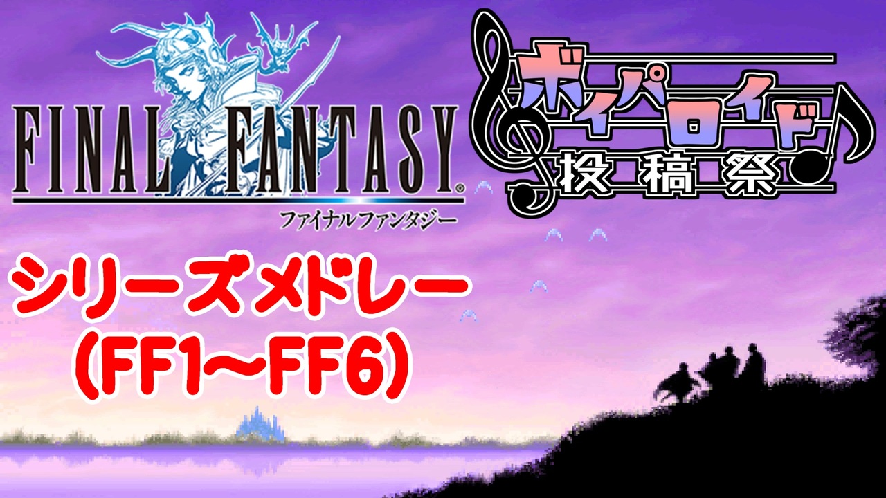 <span style="color: #ff0000; font-size: 16px;"><strong>ボイパロイド投稿祭参加です! (2021/06/05~2021/06/20 <a href="https://www.nicovideo.jp/watch/sm38275874" class="watch">sm38275874</a>)</strong></span><br><br>FF1~FF6のあんな名曲こんな名曲を歌ってもらいました。<br>長すぎてしんどかったので、ボイパロイドと言いながら<br>実はVOICEROID未使用だったり…レギュ違反ではないはず…っ<br>でも全員VOICEROID勢ではあります。<br><br>・大まかな構成<br>0:00~0:18 はじまり、マトーヤの洞窟はFF1屈指の名曲ですね。<br>0:18~6:24 ほぼ戦闘曲、たまにラスダンとかフィールドとかの曲も。<br>6:24~17:55 イベント、フィールド、各キャラのテーマを中心にゆったりと。<br>17:55~19:48 FF1の町のBGMを大合唱。<br>19:48~20:26 フィナーレ、マトーヤの洞窟で始まり、マトーヤの洞窟で終わります。<br><br>・参加キャラ<br>VOCALOID4 東北ずん子<br>VOCALOID4 紲星あかり<br>VOCALOID4 結月ゆかり穏、凛<br>VOCALOID5 桜乃そら<br>SynthesizerV 琴葉茜・葵 Lite<br>SynthesizerV 小春六花 Lite<br><br><br>譜面データはアテナ君様のFinal Fantasy シリーズ総集編メドレーを使用しています。<br>midiデータ欲しい人はffmed55とかでググれば出てきます。