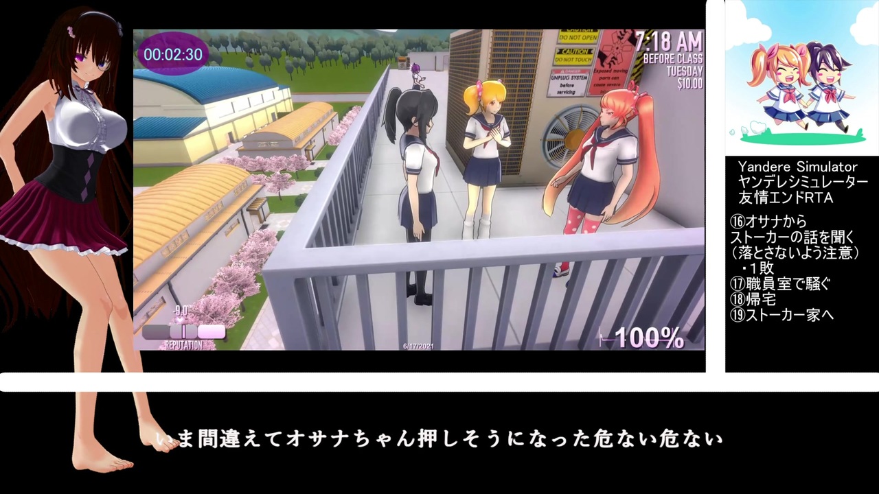You Tubeへの転載は一切許可していません<br><br>誓って殺しはやってません <br><br><strong><u>計測区間/レギュ<br>空ファイル選択時~EDのスタッフロール開始<br>オサナ友情END<br>オサナの猫を助け、先輩を諦めてもらう<br>計測タイムはSpeedRun.com基準ではなく、当ゲームニコニコ動画先駆者様基準のためロード時間も計測</u></strong><br><br>退学エンド→<a href="https://www.nicovideo.jp/watch/sm38797445" class="watch">sm38797445</a><br>物理攻撃エンド→<a href="https://www.nicovideo.jp/watch/sm38823680" class="watch">sm38823680</a><br>感電排除エンド→<a href="https://www.nicovideo.jp/watch/sm38837347" class="watch">sm38837347</a><br>再走退学エンド→<a href="https://www.nicovideo.jp/watch/sm38853028" class="watch">sm38853028</a><br><br>無編集版(You Tube)→<a href="https://youtu.be/N8lyELNACTg" target="_blank" rel="noopener nofollow">https://youtu.be/N8lyELNACTg</a><br><br>RTAマイリス⇒<a href="https://www.nicovideo.jp/mylist/69428960" target="_blank" rel="noopener">mylist/69428960</a>