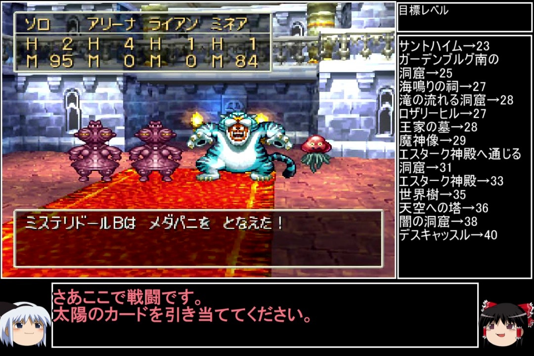 レベル上げ作業に加えて、キングレオ戦で無駄に粘ったせいで遅くなりました!<br>動画内では語られていませんが、レベル上げ中はトルネコが口塞ぎでしりょうつかいのザキを封じたり宝を盗んで活躍しています。<br><br>(※動画最後のリストにpart23で解禁した『ちからため』『キラーピアス』『てんくうのかぶと』『ときのすな』『はぐれメタルよろい』『あみタイツ』が抜けておりました。申し訳ないです)<br><br>前→<a href="https://www.nicovideo.jp/watch/sm38870088" class="watch">sm38870088</a> 次→<a href="https://www.nicovideo.jp/watch/sm38970798" class="watch">sm38970798</a><br><br>YouTube版→<a href="https://www.youtube.com/watch?v=paWgaz5aHqg&t=5s" target="_blank" rel="noopener nofollow">https://www.youtube.com/watch?v=paWgaz5aHqg&t=5s</a><br><br><br>※動画の大きさが変わる方は、お手数ですが設定→画質を自動から〇pに変えると解決します。<br>※一部機種は互換機を使用してのプレイとなります。<br><br>縛りルール(不明点はシリーズのQ&Aを参照)<br>①使った武器・防具・装飾品・道具・呪文・特技・一部特殊施設(メダル王・カジノ・移民の町)・職業(3,6,7)・仲間モンスター(4,5,6,8+7の職業)は次以降のシリーズで使用禁止。<br>(NPCキャラが使用した装備や呪文を含む。売却及び錬金素材としても使用扱い)<br><br>②裏技・バグ技の禁止。<br><br>③逃走禁止&戦闘終了時は全員生存。<br><br>④レベルを上げ過ぎない。<br>ダンジョンやボスは公式ガイドブックに記載されたレベル+3まで。<br>ラスボスは全ての呪文を習得するレベル+3程度までに収める。<br><br>⑤裏ボスも規定回数、規定ターン以内に倒す。<br>(6の裏ダンジョン突入時のみ、条件を満たすため①の職業を解禁)<br><br>(おまけ)<br>宝は可能なものに限り全回収。<br>5と6は同一モンスターの仲間不可。<br>回避可能なボスも全て倒す。<br><br><br>この動画で利用している株式会社スクウェア・エニックスを代表とする共同著作者が権利を所有する著作物及びスギヤマ工房有限会社が権利を所有する楽曲の転載・配布は禁止いたします。<br>(C) ARMOR PROJECT/BIRD STUDIO/SQUARE ENIX All Rights Reserved.<br>(C) SUGIYAMA KOBO (P) SUGIYAMA KOBO<br><br>AquesTalk2ライセンスID:AQTK2WINUSR23122185<br /><br><br>❤いいねを押していただけるとモチベーションと投稿速度が上がるので宜しくお願い致します!<br><br>作者ツイッター→ <a href="https://twitter.com/nig0117" target="_blank" rel="noopener nofollow">https://twitter.com/nig0117</a><br>PIXIV FANBOX→ <a href="https://sutanokeiji.fanbox.cc/" target="_blank" rel="noopener nofollow">https://sutanokeiji.fanbox.cc/</a><br><br>( 以前はWEB小説書いてました→ <a href="https://kakuyomu.jp/works/1177354054884910267" target="_blank" rel="noopener nofollow">https://kakuyomu.jp/works/1177354054884910267</a> )