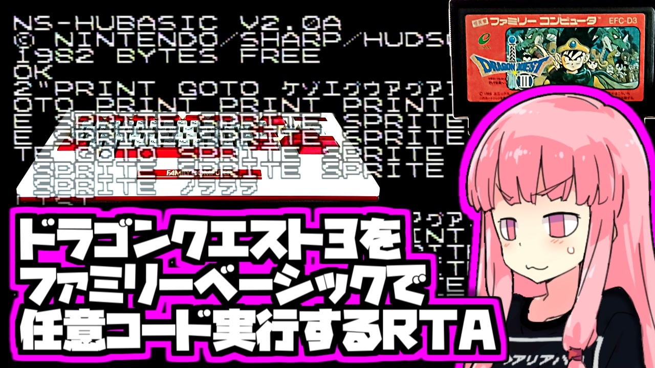 ボイロ実況でファミリーベーシックを用いたRTAは初投稿です!!!<br><br><span style="color: #ff0000;"><u>今日誕生日なのでいいねボタン押して貰えると飛んで喜びます!!</u></span><br>シリーズとして継続するつもりなので、応援の程よろしくおねがいします。<br><br>No電撃部門ってなんだよ!って人は電撃部門もご覧ください<br>→ <a href="https://www.nicovideo.jp/watch/sm39136866" class="watch">sm39136866</a><br><br>電源バグとはなんぞや?という方はブログをご参照ください。<br><a href="https://pirohiko.hatenablog.com/entry/ar1731086" target="_blank" rel="noopener nofollow">https://pirohiko.hatenablog.com/entry/ar1731086</a><br><br>前→<a href="https://www.nicovideo.jp/watch/sm39007141" class="watch">sm39007141</a><br>次→<a href="https://www.nicovideo.jp/watch/sm39286863" class="watch">sm39286863</a><br>ボイロRTAマイリスト→ <a href="https://www.nicovideo.jp/mylist/71148298" target="_blank" rel="noopener">mylist/71148298</a><br><br>この動画で利用している株式会社スクウェア・エニックスを代表とする共同著作者が権利を所有する著作物及びスギヤマ工房有限会社が権利を所有する楽曲の転載・配布は禁止いたします。<br>© 1988 ARMOR PROJECT/BIRD STUDIO/SPIKE CHUNSOFT/SQUARE ENIX All Rights Reserved.<br>© SUGIYAMA KOBO<br>※未プレイの方はネタバレ注意、既プレイの方も思い出を破壊される恐れがあります。<br>※エンディング部分の配信等を禁止する条項はガイドラインの2021年3月19日の追記で削除されています。<br /><span style="color: #00ff00; font-size: 18px;"><strong><u>RTA in biim 2025 winterにて、年末年始にRTAを走ります!!!!<br>↓イベントスケジュールはこちら↓<br><a href="https://horaro.org/rtainbiim/2025-w" target="_blank" rel="noopener nofollow">https://horaro.org/rtainbiim/2025-w</a></u></strong></span><br><s> </s><br>色んなシリーズを並行投稿中です!<br>気楽なRTAがしたい茜ちゃん→ <a href="https://www.nicovideo.jp/series/230433" target="_blank" rel="noopener">series/230433</a><br>すべてを救いたい葵ちゃん→ <a href="https://www.nicovideo.jp/series/273860" target="_blank" rel="noopener">series/273860</a><br>単発実況→<a href="https://www.nicovideo.jp/series/369107" target="_blank" rel="noopener">series/369107</a><br>AmongUs眼鏡部→<a href="https://www.nicovideo.jp/series/283075" target="_blank" rel="noopener">series/283075</a><br>音MADとか→<a href="https://www.nicovideo.jp/series/372491" target="_blank" rel="noopener">series/372491</a><br>Youtubeにも同時に投稿しています<br><a href="http://youtube.com/pirohiko?sub_confirmation=1" target="_blank" rel="noopener nofollow">http://youtube.com/pirohiko?sub_confirmation=1</a><br>Twitter: <a href="https://twitter.com/pirohiko" target="_blank" rel="noopener nofollow">https://twitter.com/pirohiko</a><br><u> </u><br><span style="color: #00ff00; font-size: 16px;"><strong>差し入れ感覚でクリエイターサポートしていただけると飛び跳ねて喜びます!<br><a href="https://creator-support.nicovideo.jp/registration/37189" target="_blank" rel="noopener nofollow">https://creator-support.nicovideo.jp/registration/37189</a></strong></span><br><s> </s><br><span style="color: #ff0000; font-size: 18px;"><strong>最新動画→<a href="https://www.nicovideo.jp/watch/sm45655408" class="watch">sm45655408</a></strong></span><br><span style="color: #4a86e8; font-size: 18px;"><strong>直近のオススメ→<a href="https://www.nicovideo.jp/watch/sm45655408" class="watch">sm45655408</a></strong></span><br><s> </s>
