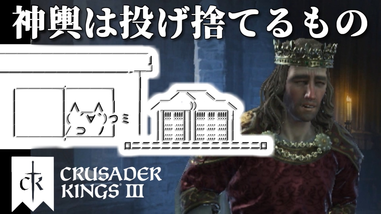 神輿は投げ捨てるものの巻<br>Ver1.44<br><span style="color: #ff0000;">Youtubeチャンネル:<a href="https://www.youtube.com/channel/UCIgzloQ_KfcUN_AcvlxtDdg" target="_blank" rel="noopener nofollow">https://www.youtube.com/channel/UCIgzloQ_KfcUN_AcvlxtDdg</a></span><br><span style="color: #0000ff;">Twitter:<a href="https://twitter.com/proffesor2sk" target="_blank" rel="noopener nofollow">https://twitter.com/proffesor2sk</a></span><br>※その他のプレイ講座はこちら:<a href="https://www.nicovideo.jp/mylist/34307950" target="_blank" rel="noopener">mylist/34307950</a><br>[Crusader Kings 3] Copylight © [2020] Paradox Interactive AB. www.paradoxplaza.com<br><br>使わせていただいた素材サイト<br>フォント:「M+」「装甲明朝」「たぬき油性マジック」「しねきゃぷしょん」「あんずもじ」<br>フレーム:「Frame Design」<br>効果音:「効果音ラボ」「効果音辞典」「OtoLogic」<br>BGM:<br>Behind The Sword by Alexander Nakarada | <a href="https://www.serpentsoundstudios.com" target="_blank" rel="noopener nofollow">https://www.serpentsoundstudios.com</a><br>Music promoted by <a href="https://www.free-stock-music.com" target="_blank" rel="noopener nofollow">https://www.free-stock-music.com</a><br>Attribution 4.0 International (CC BY 4.0)<br><a href="https://creativecommons.org/licenses/by/4.0/" target="_blank" rel="noopener nofollow">https://creativecommons.org/licenses/by/4.0/</a>