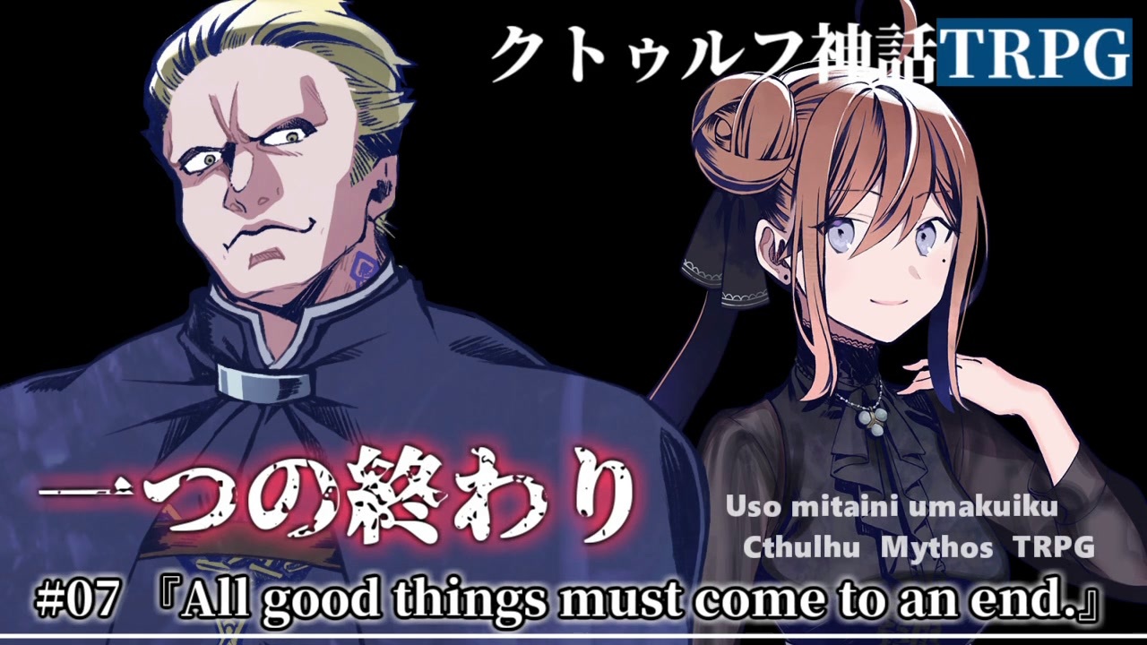 物事には終わりが訪れる。<br><br>うそうま卓のクトゥルフ神話TRPGリプレイ動画、第一チーム(九鬼、キリコ、ちはる、教授、タナカ、富田)最終章です。<br><br>☆イベント情報☆<br><a href="https://www.melonbooks.co.jp/feature/detail.php?feature_id=2331" target="_blank" rel="noopener nofollow">https://www.melonbooks.co.jp/feature/detail.php?feature_id=2331</a><br>メロンブックスさんの「夏のメガ超同人祭」に参加します!<br>開催は【8/21 ~ 8/22】で、配置場所は「祭16」です<br>詳細は後ほどツイッターのほうでも投稿します!<br><br>前:<a href="https://www.nicovideo.jp/watch/sm39174529" class="watch">sm39174529</a> / 次:2021/8/20の予定です<br />【 うそうま卓シナリオ等まとめ:<a href="https://usouma.booth.pm/" target="_blank" rel="noopener nofollow">https://usouma.booth.pm/</a> 】<br><br>マイリスト:<a href="https://www.nicovideo.jp/mylist/57250859" target="_blank" rel="noopener">mylist/57250859</a> <a href="https://www.nicovideo.jp/mylist/67175059" target="_blank" rel="noopener">mylist/67175059</a><br>ツイッター <a href="https://twitter.com/shitouba_trpg" target="_blank" rel="noopener nofollow">https://twitter.com/shitouba_trpg</a><br>連絡先 usouma1010@gmail.com<br><br>クトゥルフ神話TRPG<br>第1チーム立ち絵:転(くるり)さん <a href="https://twitter.com/kururirura" target="_blank" rel="noopener nofollow">https://twitter.com/kururirura</a><br>第2チーム立ち絵:茨乃(しの)さん <a href="https://twitter.com/sino_eefy" target="_blank" rel="noopener nofollow">https://twitter.com/sino_eefy</a><br>第3チーム立ち絵:スイさん <a href="https://twitter.com/moe_sui" target="_blank" rel="noopener nofollow">https://twitter.com/moe_sui</a><br>