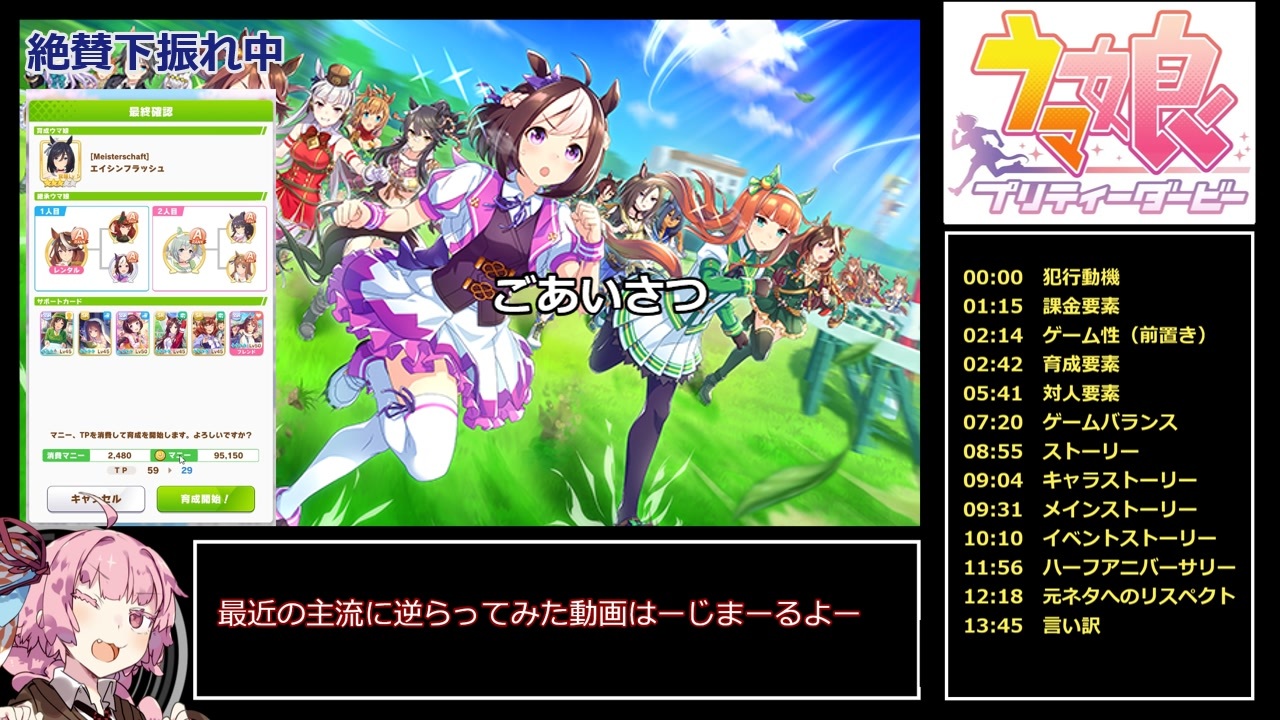 大体タイトル通りです。投稿者は微課金以上廃人未満の少課金勢です<br>完全単発動画なので続きなどはありません<br>この動画に盛り込めなかった話(ライブ関連)も多いですが、尺の都合ということでご勘弁ください<br><br>エイシンフラッシュはかわいい<br><br>いいねしてもらえると特典がつきます<br><br>2021/8/26<br>誤解させてしまっている方がいらっしゃいますので、こちらで釈明させていただきます<br>本動画は無条件にウマ娘を肯定する目的ではなく、あくまで好意的に解釈できる部分を、その理由とあわせて語っていくものとなっております<br>故に、褒められない部分につきましては投稿者個人の感じたことをそのまま書いています<br>動画の趣旨を誤解させてしまう描写をしてしまい、申し訳ありませんでした<br><br>2021/8/26 17:40<br>コメントで気付きましたがゲームジャンル毎時のランキングで1位だったみたいで驚きました<br>このような個人的解釈による自分語りを見ていただけて、嬉しい限りです<br><s>でも続きや第二弾は作りません(鋼の意志)</s><br><br>2021/8/27 0:00<br>>>ウマ娘カテゴリ1位<br>このような内容に粗が残るお気持ち表明動画が恐れ多いです……<br>それはともかくとして、多くの方にご視聴いただけてよかったです<br><s>でも釈明動画や補足動画は作りません(鋼の意志)</s><br><br>ところで皆さんは鋼の意志が発動しているのを見たことありますか?<br>投稿者は2回だけあります<br><a href="https://www.nicovideo.jp/watch/sm39314845" class="watch">sm39314845</a><br><br>2021/10/15<br>育成が上手くいかないのでウマ娘MADを作りました。<br><a href="https://www.nicovideo.jp/watch/sm39485437" class="watch">sm39485437</a><br><br><span style="color: #d9d9d9;">普段は戦闘機でぶんどどするゲームの動画作ってます<br><br>2021/8/26<br>おかしい…メインで作ってるWarThunder動画がゴミみたいに思えるほどのいいねが入っている…<br>なぜ——</span>