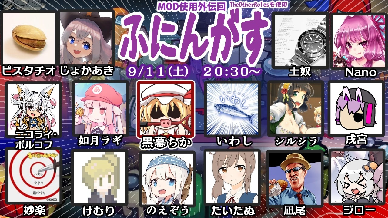 2021/9/11 Among usを15人で遊びました。<br>今回追加された「恋人(Lovers)」は、片方が死ぬともう片方も同時に死にます。2人とも生存でゲーム終了が勝利条件です。<br>最後の演出は「推理」というより「まとめ」ですが、変更すると手間なのでそのままにしました。<br>【配信アーカイブ】<a href="https://youtu.be/Gp3mFhouNic" target="_blank" rel="noopener nofollow">https://youtu.be/Gp3mFhouNic</a> (5試合目を動画化)<br><br>別視点動画<br>ニコライ 動画内3試合目 <a href="https://www.nicovideo.jp/watch/sm39332928" class="watch">sm39332928</a><br><br>観戦者<br>ふにちか <a href="https://www.nicovideo.jp/user/1399358" target="_blank" rel="noopener">user/1399358</a><br>参加者<br>戌宮 <a href="https://www.nicovideo.jp/user/30627096" target="_blank" rel="noopener">user/30627096</a><br>いわし <a href="https://www.nicovideo.jp/user/15086302" target="_blank" rel="noopener">user/15086302</a><br>如月ラギ <a href="https://www.nicovideo.jp/user/814203" target="_blank" rel="noopener">user/814203</a><br>けむり <a href="https://www.nicovideo.jp/user/96161400" target="_blank" rel="noopener">user/96161400</a><br>じょかあき <a href="https://www.nicovideo.jp/user/390917" target="_blank" rel="noopener">user/390917</a><br>シルシラ <a href="https://www.nicovideo.jp/user/220860" target="_blank" rel="noopener">user/220860</a><br>ジロー <a href="https://www.nicovideo.jp/user/12009913" target="_blank" rel="noopener">user/12009913</a><br>たいたぬ <a href="https://www.nicovideo.jp/user/41035256" target="_blank" rel="noopener">user/41035256</a><br>土奴 <a href="https://www.nicovideo.jp/user/32122304" target="_blank" rel="noopener">user/32122304</a><br>Nano <a href="https://www.nicovideo.jp/user/21297144" target="_blank" rel="noopener">user/21297144</a><br>凪尾 <a href="https://www.nicovideo.jp/user/2620730" target="_blank" rel="noopener">user/2620730</a><br>ニコライ・ボルコフ <a href="https://www.nicovideo.jp/user/13647798" target="_blank" rel="noopener">user/13647798</a><br>のえぞう <a href="https://www.nicovideo.jp/user/13648411" target="_blank" rel="noopener">user/13648411</a><br>妙楽 <a href="https://www.nicovideo.jp/user/3097821" target="_blank" rel="noopener">user/3097821</a><br>ピスタチオ 動画作った人<br><br />X(旧Twitter) <a href="http://bit.ly/2YV0a2i" target="_blank" rel="noopener nofollow">http://bit.ly/2YV0a2i</a><br><span style="color: #000000; font-size: 13px;">Youtubeチャンネル </span><a href="http://bit.ly/2KAwr5A" target="_blank" rel="noopener nofollow">http://bit.ly/2KAwr5A</a><br>Discordサーバー「ローザリア」 <a href="https://discord.com/invite/QmTBcpneYk" target="_blank" rel="noopener nofollow">https://discord.com/invite/QmTBcpneYk</a><br>ほしいも <a href="https://bit.ly/3zS3n0T" target="_blank" rel="noopener nofollow">https://bit.ly/3zS3n0T</a><br>pixiv fanbox <a href="https://bit.ly/3kR7u95" target="_blank" rel="noopener nofollow">https://bit.ly/3kR7u95</a><br>スイッチフレコ:SW-1027-2197-7131<br>Steamフレコ:139810042<br>PSNID:C_A_Neidhardt