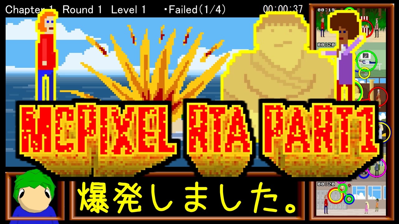 むしゃくしゃして走った、ゲームは何でもよかった、今は初投稿している。<br><br>~レギュレーション~<br>すべてのレベルで金ラベルを取得しエンディングを見ること<br>ゲームはSteam版を遊びました<br><br>~計測~<br>タイマースタート:「Press to start」の赤いボタンをクリック<br>タイマーストップ:エンディング後のリザルト画面表示まで<br><br>~禁止事項~<br>ギャグのスキップ禁止(デフォルトで右クリックやスペースキーの使用)<br>マウスの位置座標取得、連打ツールなどアシストソフトの使用を禁止<br><br>本家RTAとしてはレミングス以来です<br>登山できなくて、なんか久々に作りたいなって考えてたらこんなゲームになってしもうた<br>脳に損傷が起きないよう、1週毎に15分程度の動画をうpしていく予定です<br><br>たたき台の作品であり、更新されればとても嬉しいけど…誰もしないよなぁ<br><br>~使用した素材など~<br>CoeFont_studio:<a href="https://CoeFont.studio" target="_blank" rel="noopener nofollow">https://CoeFont.studio</a><br>PROMINENCE@おさかなP様:MMDレミングモデル:<a href="https://www.nicovideo.jp/watch/sm11803464" class="watch">sm11803464</a><br><br>~参考動画~<br>大倉岳でアルゴリズムこうしん:<a href="https://www.nicovideo.jp/watch/sm38797843" class="watch">sm38797843</a><br><br>次回PART2:<a href="https://www.nicovideo.jp/watch/sm39443440" class="watch">sm39443440</a> McPixelマイリスト<a href="https://www.nicovideo.jp/mylist/71922687" target="_blank" rel="noopener">mylist/71922687</a><br><br>前作RTA SFC版レミングス any%:<a href="https://www.nicovideo.jp/watch/sm36551933" class="watch">sm36551933</a><br>