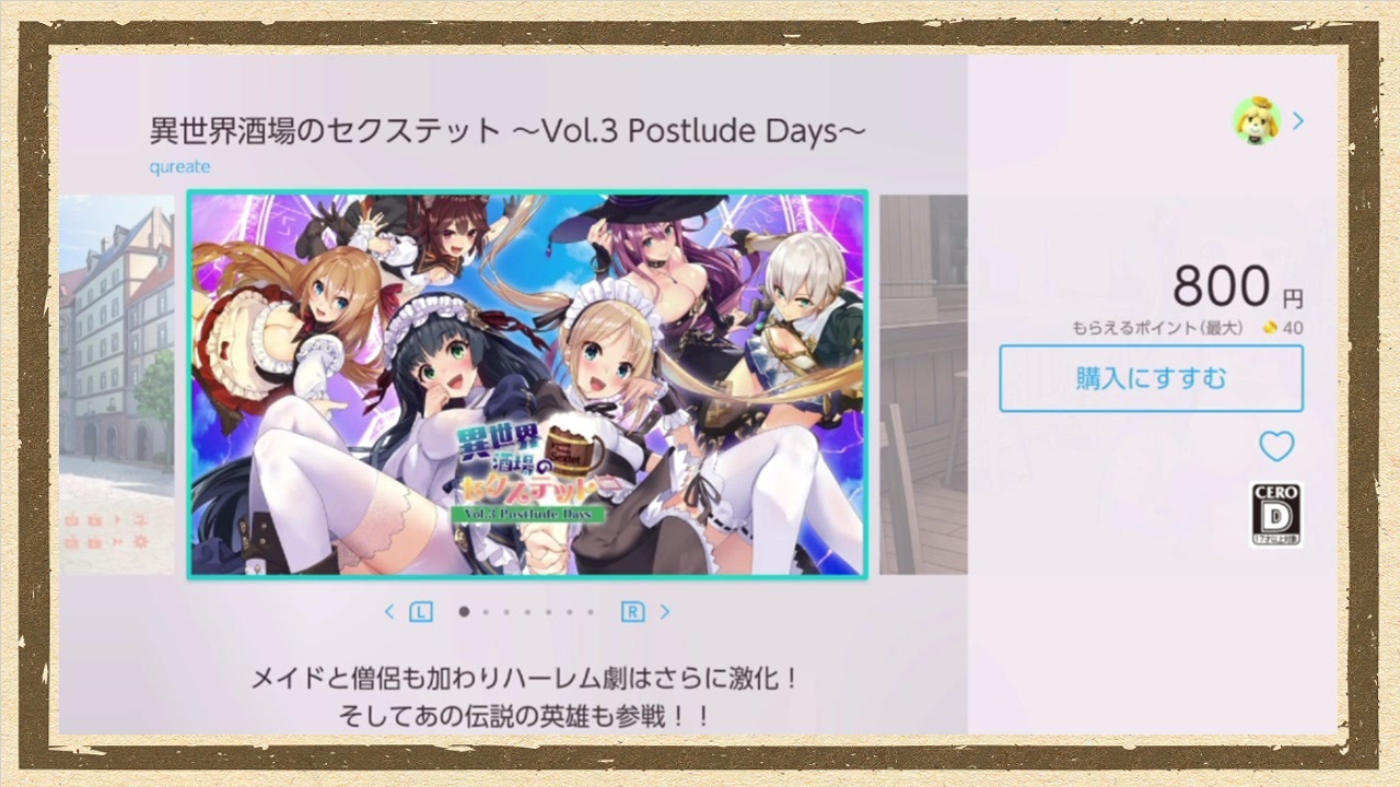 ▽ ニンテンドーeショップを友人と2人でパトロールしてみました。<br> 古い友人とゲーム屋で駄弁るだけ駄弁って何も買わずに帰るみたいな、そんな雰囲気(だけ)の動画です <br>喋っている人:稲葉百万鉄(うp主)、がみ(友人)<br><br>これを10回もやっていることに驚く。<br><br><br><a href="https://www.nicovideo.jp/watch/sm39288386" class="watch">sm39288386</a> ⇐ 前 | <a href="https://www.nicovideo.jp/mylist/61271807" target="_blank" rel="noopener">mylist/61271807</a> | 次⇒<a href="https://www.nicovideo.jp/watch/sm39874216" class="watch">sm39874216</a><br><br>▽ 高画質版〈Youtube〉<br><a href="https://youtu.be/Anxawi6xJkM" target="_blank" rel="noopener nofollow">https://youtu.be/Anxawi6xJkM</a><br><br>▽ Twitter<br>がみ:<a href="http://twitter.com/gamisama" target="_blank" rel="noopener nofollow">http://twitter.com/gamisama</a><br>稲葉:<a href="http://twitter.com/fuhiky" target="_blank" rel="noopener nofollow">http://twitter.com/fuhiky</a>