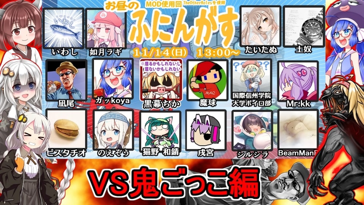 11月14日に行われたふにんがすの余興「鬼ごっこ」を動画にしました。<br>ボイチャ繋ぎながらワイワイしてたので、しゃべってる相手が違ってたりするかもです。<br><br>YouTube高画質版<br><a href="https://youtu.be/OyYhi9sp84U" target="_blank" rel="noopener nofollow">https://youtu.be/OyYhi9sp84U</a><br><br>魔球さん視点<br><a href="https://www.nicovideo.jp/watch/sm39630045" target="_blank" rel="noopener nofollow">https://www.nicovideo.jp/watch/sm39630045</a><br><br>琴葉姉妹立ち絵公開しました<br><a href="https://seiga.nicovideo.jp/seiga/im10803182" target="_blank" rel="noopener nofollow">https://seiga.nicovideo.jp/seiga/im10803182</a><br><br>黒幕視点<br>ふにちかさん→<a href="https://www.nicovideo.jp/user/1399358" target="_blank" rel="noopener">user/1399358</a><br><br>参加者一覧(敬称略)<br>戌宮→<a href="https://www.nicovideo.jp/user/30627096" target="_blank" rel="noopener">user/30627096</a><br>いわし→<a href="https://www.nicovideo.jp/user/15086302" target="_blank" rel="noopener">user/15086302</a><br>ガッkoya→<a href="https://www.nicovideo.jp/user/24250283" target="_blank" rel="noopener">user/24250283</a><br>如月ラギ→<a href="https://www.nicovideo.jp/user/814203" target="_blank" rel="noopener">user/814203</a><br>国際信州学院大学ボイロ部→<a href="https://www.nicovideo.jp/user/98044118" target="_blank" rel="noopener">user/98044118</a><br>シルシラ→<a href="https://www.nicovideo.jp/user/220860" target="_blank" rel="noopener">user/220860</a><br>たいたぬ→<a href="https://www.nicovideo.jp/user/41035256" target="_blank" rel="noopener">user/41035256</a><br>土奴→<a href="https://www.nicovideo.jp/user/32122304" target="_blank" rel="noopener">user/32122304</a><br>凪尾→<a href="https://www.nicovideo.jp/user/2620730" target="_blank" rel="noopener">user/2620730</a><br>猫野和錆→<a href="https://www.nicovideo.jp/user/526751" target="_blank" rel="noopener">user/526751</a><br>のえぞう→<a href="https://www.nicovideo.jp/user/13648411" target="_blank" rel="noopener">user/13648411</a><br>ピスタチオ→<a href="https://www.nicovideo.jp/user/53716331" target="_blank" rel="noopener">user/53716331</a><br>BeamManP→<a href="https://www.nicovideo.jp/user/421727" target="_blank" rel="noopener">user/421727</a><br>魔球→<a href="https://www.nicovideo.jp/user/963352" target="_blank" rel="noopener">user/963352</a><br>Mr.kk→<a href="https://www.nicovideo.jp/user/618249" target="_blank" rel="noopener">user/618249</a><br><br>楽曲提供<br>ぺんぺんさん<br><a href="https://www.nicovideo.jp/user/93911302" target="_blank" rel="noopener nofollow">https://www.nicovideo.jp/user/93911302</a><br><br>凪尾立ち絵提供<br>高萩先生<br><a href="https://twitter.com/takahagi_k" target="_blank" rel="noopener nofollow">https://twitter.com/takahagi_k</a><br><br>ふにんがす動画マイリスト<br><a href="https://www.nicovideo.jp/mylist/71314393" target="_blank" rel="noopener">mylist/71314393</a><br><br>次回 Part11 銀河人狼忍者伝ふにんじゃす<br><a href="https://www.nicovideo.jp/watch/sm39673946" class="watch">sm39673946</a><br><br>前回 Part9 VSモーフィング<br><a href="https://www.nicovideo.jp/watch/sm39612374" class="watch">sm39612374</a><br><br>Part1 <br><a href="https://www.nicovideo.jp/watch/sm38982979" target="_blank" rel="noopener nofollow">https://www.nicovideo.jp/watch/sm38982979</a> <br />ふにんがす動画マイリスト <a href="https://www.nicovideo.jp/mylist/71314393" target="_blank" rel="noopener">mylist/71314393</a><br>GTA5手配度MAXシリーズ <a href="https://www.nicovideo.jp/mylist/18374381" target="_blank" rel="noopener">mylist/18374381</a><br><br>【凪尾マイクラ等サーバー参加方法】<br>ニコニコ凪尾チャンネル・クリエイターサポート加入者・NicoFTパス所持者 YouTubeメンバーシップゴールド以上の方々が参加できます! 分からないことがあったら気軽に質問してください!<br>ニコニコチャンネル<br><a href="https://ch.nicovideo.jp/nagio-gta?ref=pc_mypage_top" target="_blank" rel="noopener nofollow">https://ch.nicovideo.jp/nagio-gta?ref=pc_mypage_top</a><br>※会員限定動画はニコニコチャンネル加入者・YouTubeメンバーシップノーマル以上から視聴できます。<br><br>■超会議2025グッズ通販(pixivBooth)<br><a href="https://nagio-gta25252.booth.pm/" target="_blank" rel="noopener nofollow">https://nagio-gta25252.booth.pm/</a><br>■ずんだもん立ち絵公開しました<br><a href="http://nico.ms/im10892141" target="_blank" rel="noopener nofollow">http://nico.ms/im10892141</a><br>■琴葉姉妹立ち絵公開しました<br><a href="https://seiga.nicovideo.jp/seiga/im10803182" target="_blank" rel="noopener nofollow">https://seiga.nicovideo.jp/seiga/im10803182</a><br><br>楽曲提供:ぺんぺんさん:<a href="https://www.nicovideo.jp/user/93911302" target="_blank" rel="noopener">user/93911302</a><br>ふにちかさん作凪尾立ち絵:<a href="https://seiga.nicovideo.jp/seiga/im10956602?nicorepotwitter_upload_illust" target="_blank" rel="noopener nofollow">https://seiga.nicovideo.jp/seiga/im10956602?nicorepotwitter_upload_illust</a><br><br>▼以下配信活動ページ:よかったら登録してね!<br>ニコ生<br><a href="https://www.nicovideo.jp/user/2620730/live_programs?ref=pc_userpage_menu" target="_blank" rel="noopener nofollow">https://www.nicovideo.jp/user/2620730/live_programs?ref=pc_userpage_menu</a><br>YouTubeiS4mQ7q8w?sub_confirmation=1<br>Twitch:<a href="https://www.twitch.tv/nagiogames" target="_blank" rel="noopener nofollow">https://www.twitch.tv/nagiogames</a><br>ツイキャス:<a href="https://twitcasting.tv/g:106250988999788152314" target="_blank" rel="noopener nofollow">https://twitcasting.tv/g:106250988999788152314</a><br><br>VOICEVOX:ずんだもん VOICEVOX:九