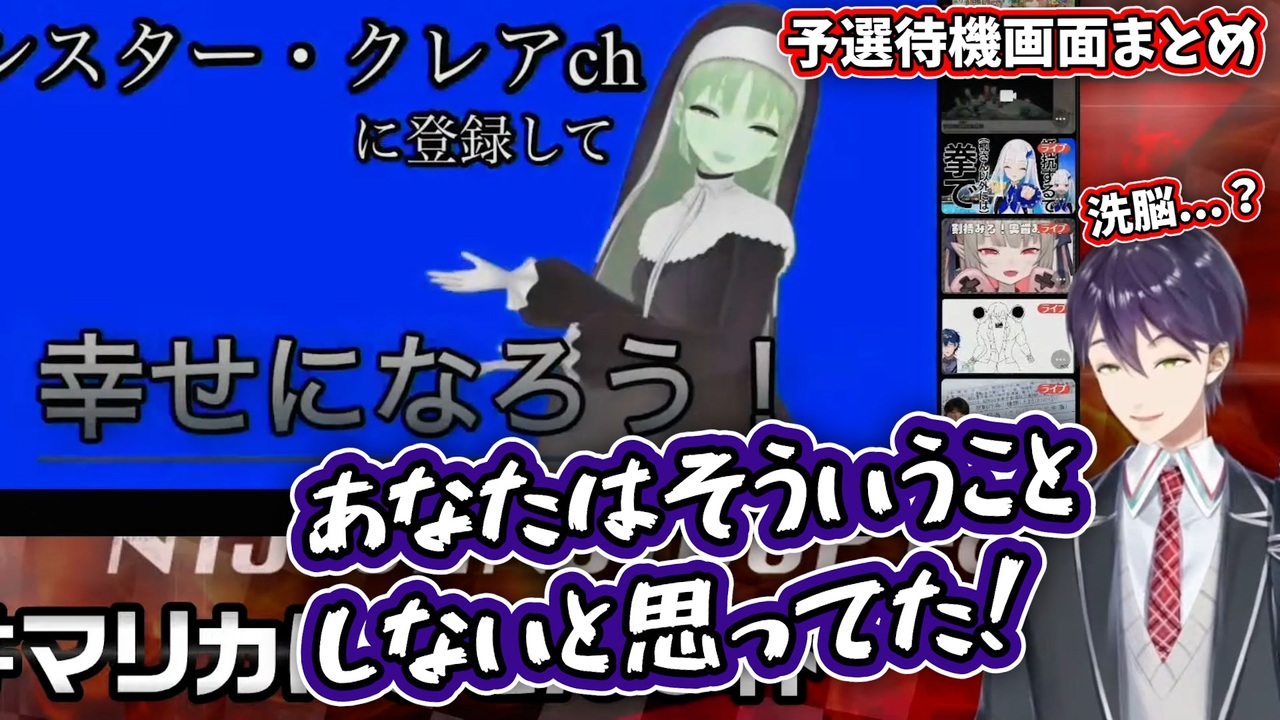 第4回マリカにじさんじ杯の待機画面でアピール合戦するライバーへツッコミ続ける剣持刀也と笹木咲の様子まとめです<br>※テロップの「リーグ」が「チーム」になってますすいません!<br><br>運営視点<br>【マリオカート8DX】第4回マリオカートにじさんじ杯【#マリカにじさんじ杯】<br><a href="https://www.youtube.com/watch?v=kvQt_-BvFng" target="_blank" rel="noopener nofollow">https://www.youtube.com/watch?v=kvQt_-BvFng</a><br><br>《主催》<br>剣持刀也:<a href="https://t.co/dNfUPFBBch?amp=1" target="_blank" rel="noopener nofollow">https://t.co/dNfUPFBBch?amp=1</a><br><br><br>◆タイムスタンプ◆<br><a href="#" class="seekTime" data-seekTime="0:00" onclick="seekNicoPlayer('#0:00'); return false;">#0:00</a> Aリーグ<br>(鈴鹿詩子、グウェル・オス・ガール、加賀美ハヤト、レイン・パターソン、来栖夏芽、安土桃、愛園愛美、町田ちま、渋谷ハジメ、アルス・アルマル)<br><br><a href="#" class="seekTime" data-seekTime="2:34" onclick="seekNicoPlayer('#2:34'); return false;">#2:34</a> Bリーグ<br>(える、朝日南アカネ、星川サラ、奈羅花、轟京子、花畑チャイカ、レヴィ・エリファ、天宮こころ、フレン・E・ルスタリオ、文野環)<br><br><a href="#" class="seekTime" data-seekTime="5:28" onclick="seekNicoPlayer('#5:28'); return false;">#5:28</a> Cリーグ<br>(レオス・ヴィンセント、早瀬走、夕陽リリ、シスター・クレア、エリー・コニファー、笹木咲、リゼ・ヘルエスタ、甲斐田晴、魔界ノりりむ、樋口楓)<br><br><a href="#" class="seekTime" data-seekTime="8:08" onclick="seekNicoPlayer('#8:08'); return false;">#8:08</a> Dリーグ<br>(でびでび・でびる、桜凛月、魔使マオ、弦月藤士郎、葛葉、エクス・アルビオ、神田笑一、雪城眞尋、ローレン・イロアス、小野町春香)<br><br><a href="#" class="seekTime" data-seekTime="10:30" onclick="seekNicoPlayer('#10:30'); return false;">#10:30</a> Eリーグ<br>(黒井しば、白雪巴、竜胆尊、卯月コウ、ジョー・力一、鈴谷アキ、三枝明那、椎名唯華、空星きらめ、アンジュ・カトリーナ)<br><br><a href="#" class="seekTime" data-seekTime="12:55" onclick="seekNicoPlayer('#12:55'); return false;">#12:55</a> Fリーグ<br>(郡道美玲、ベルモンド・バンデラス、月ノ美兎、鷹宮リオン、アクシア・クローネ、舞元啓介、伏見ガク、西園チグサ、緑仙、葉加瀬冬雪)<br><br><a href="#" class="seekTime" data-seekTime="15:09" onclick="seekNicoPlayer('#15:09'); return false;">#15:09</a> Gリーグ<br>(剣持刀也、シェリン・バーガンディ、フミ、夜見れな、山神カルタ、ルイス・キャミー、オリバー・エバンス、鈴木勝、長尾景、北小路ヒスイ)<br><br>#にじさんじ切り抜き<br /><span style="font-size: 10px;">▷Vつべの助かる切り抜き(YouTube)→<a href="http://www.youtube.com/channel/UCTk7oeLeSCOO4Kb14-pHWYA?sub_confirmation=1" target="_blank" rel="noopener nofollow">http://www.youtube.com/channel/UCTk7oeLeSCOO4Kb14-pHWYA?sub_confirmation=1</a></span>