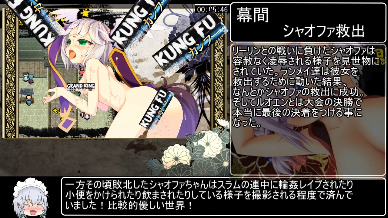 今日はマンゴーラッシーとカレーライスを食べたいと思います。<br><br><strong>【あぶらそば日和】</strong>様制作のR-18RPG<br><strong>【カンフー・グランドキング】</strong>RTAです。<br><br>計測開始:new game選択時<br>計測終了:【劇終】が表示された瞬間<br><br>単発&パート1:<a href="https://www.nicovideo.jp/mylist/70659794" target="_blank" rel="noopener">mylist/70659794</a><br><br>twitter:@hihidowser<br><br>スマホやタブレット等から見られない方はこちらの動画を参考にすると<br>見られるようになるはずです→ <a href="https://www.nicovideo.jp/watch/sm38575952" class="watch">sm38575952</a><br><br><span style="font-size: 16px;"><strong>本作品の購入は下記サイトにて!<br>DLsite(PC)<br><br>FANZA(PC)<br><br>HBOX(スマホ)<br></span></strong>