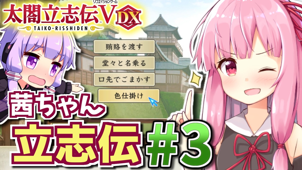 戦国時代が舞台の自由に戦国の世を生き抜く戦略SLG「太閤立志伝5 DX」を、結月ゆかりさんと琴葉茜ちゃんがうつけ型新武将でプレイします。<br>未プレイの初心者向けの丁寧な解説を加えてるのでプレイ済みの方々はご了承ください。<br>第3話は太閤立志伝の職業への仕官回。茶会で親密度を上げたりして武士への就職を目指します。<br><br><br>前 : 第2話(<a href="https://www.nicovideo.jp/watch/sm40521163" class="watch">sm40521163</a>) <-> 次 : (<a href="https://www.nicovideo.jp/watch/sm40570862" class="watch">sm40570862</a>)<br>このシリーズのリンク: <a href="https://www.nicovideo.jp/series/323444" target="_blank" rel="noopener">series/323444</a><br><br>■ プレイ環境: 太閤立志伝V DX PC版 (Ver1.0.1)<br>著作権表示<br>©コーエーテクモゲームス<br><br />HoI4プレイ講座 → (<a href="https://www.nicovideo.jp/mylist/62136132" target="_blank" rel="noopener">mylist/62136132</a>)<br>EU4プレイ講座→(<a href="https://www.nicovideo.jp/mylist/61049948" target="_blank" rel="noopener">mylist/61049948</a>)<br>CK3プレイ講座→(<a href="https://www.nicovideo.jp/series/191974" target="_blank" rel="noopener">series/191974</a>)<br>Stellarisプレイ講座→(<a href="https://www.nicovideo.jp/series/263583" target="_blank" rel="noopener">series/263583</a>)<br>Vic3プレイ講座→(<a href="https://www.nicovideo.jp/series/364690" target="_blank" rel="noopener">series/364690</a>)<br>赤いシムシティ実況動画 → (<a href="https://www.nicovideo.jp/series/8074" target="_blank" rel="noopener">series/8074</a>)<br>太閤立志伝5 DX実況動画→ (<a href="https://www.nicovideo.jp/series/323444" target="_blank" rel="noopener">series/323444</a>)<br>信長の野望 小田家プレイ動画 → (<a href="https://www.nicovideo.jp/series/353641" target="_blank" rel="noopener">series/353641</a>)<br>紲星あかりF1参戦記→(<a href="https://www.nicovideo.jp/series/222744" target="_blank" rel="noopener">series/222744</a>)<br>あかねとあかりのソビエト国境警備隊!→ (<a href="https://www.nicovideo.jp/series/394983" target="_blank" rel="noopener">series/394983</a>)<br>Cities: Skylines2都市開発プレイ動画 → (<a href="https://www.nicovideo.jp/series/436779" target="_blank" rel="noopener">series/436779</a>)<br>Manor Lords村作りプレイ動画 → (<a href="https://www.nicovideo.jp/series/468306" target="_blank" rel="noopener">series/468306</a>)<br>全動画投稿リスト (<a href="https://www.nicovideo.jp/user/77964272" target="_blank" rel="noopener">user/77964272</a>)
