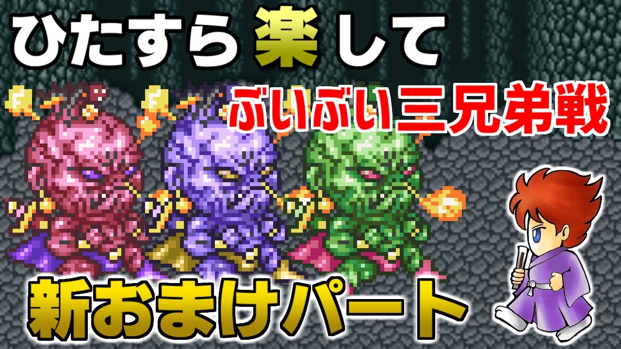まだ倒してなかった第三世界のボスたちに挑みます。<br><br>プレイ条件<br>1.最少勝利回数でクリア<br>2.必須戦闘以外で稼ぎ(盗む、とらえる)をしない<br>3.道中のアイテムは回収しない(戦闘での入手、店での購入はOK)<br>4.編集は頑張らない<br><br><a href="https://www.nicovideo.jp/watch/sm40582613" class="watch">sm40582613</a>←前|次→<a href="https://www.nicovideo.jp/watch/sm40591896" class="watch">sm40591896</a><br>新おまけパート①→<a href="https://www.nicovideo.jp/watch/sm40568979" class="watch">sm40568979</a><br><br>ひたすら楽してFF5マイリスト→<a href="https://www.nicovideo.jp/mylist/59171106" target="_blank" rel="noopener">mylist/59171106</a><br><br>他の挑戦シリーズとか→<a href="https://www.nicovideo.jp/mylist/3220744" target="_blank" rel="noopener">mylist/3220744</a><br>YouTube版→<a href="https://www.youtube.com/playlist?list=PLrkOMyVpbtkffz4VYQz3yLc3htmiX7om0" target="_blank" rel="noopener nofollow">https://www.youtube.com/playlist?list=PLrkOMyVpbtkffz4VYQz3yLc3htmiX7om0</a><br><br>© 1992, 2021 SQUARE ENIX CO., LTD. All Rights Reserved.<br>LOGO ILLUSTRATION: © 1992 YOSHITAKA AMANO