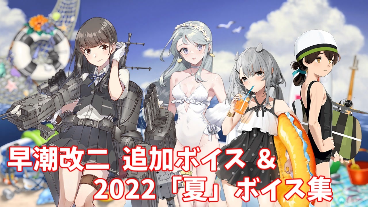 早潮改二の追加ボイスと、25隻の新規「夏」「夏カレー」「2022春イベント」ボイス集です。<br>6/17のオンメンテで期間限定実装された「2022春イベント」ボイスと「梅雨mode」も収録しています。<br>2021の「夏」ボイスはこちら→ <a href="https://www.nicovideo.jp/watch/sm39039182" class="watch">sm39039182</a> <br><br><a href="#" class="seekTime" data-seekTime="00:04" onclick="seekNicoPlayer('#00:04'); return false;">#00:04</a> 早潮改二 追加ボイス<br><a href="#" class="seekTime" data-seekTime="00:41" onclick="seekNicoPlayer('#00:41'); return false;">#00:41</a> 限定ボイス(図鑑No.順)<br>(金剛 比叡 榛名 霧島 衣笠 大和 矢矧 狭霧 Janus 冬月 佐渡 Hornet Helena 長鯨 第四号海防艦 <br>第三〇号海防艦 松 梅 玉波 Conte_di_Cavour 伊201 Scamp 昭南 山汐丸 倉橋)<br><br>【新規絵】<br>(早潮改二 曙改二 高波改二 最上改二 最上改二特 衣笠 衣笠改二 狭霧 狭霧改 <br>春日丸 大鷹 大鷹改 大鷹改二 Gambier_Bay_Mk.II Helena Helena改 第三〇号海防艦 伊201 山汐丸)<br><br>前|大和改二 追加ボイス&2022「梅雨」ボイス集 (6/8アップデート) <a href="https://www.nicovideo.jp/watch/sm40601606" class="watch">sm40601606</a><br><strong>次|Samuel B.Roberts Mk.II 追加ボイス&2022「夏」ボイス集② (8/4アップデート) </strong><a href="https://www.nicovideo.jp/watch/sm40876437" class="watch">sm40876437</a><br><br>艦これ追加ボイス集 マイリスト(<a href="https://www.nicovideo.jp/mylist/40513442" target="_blank" rel="noopener">mylist/40513442</a>)<br>シリーズ(<a href="https://www.nicovideo.jp/series/34200" target="_blank" rel="noopener">series/34200</a>)<br><br>Youtubeでも活動しています。<br>チャンネル <a href="https://www.youtube.com/channel/UCTYYB9O7hiQlH6Ee-Xxlbpg" target="_blank" rel="noopener nofollow">https://www.youtube.com/channel/UCTYYB9O7hiQlH6Ee-Xxlbpg</a><br>