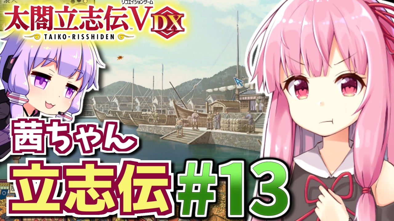 戦国時代が舞台の自由に戦国の世を生き抜く戦略SLG「太閤立志伝5 DX」を、結月ゆかりさんと琴葉茜ちゃんがうつけ型新武将でプレイします。<br>未プレイの初心者向けの丁寧な解説を加えてるのでプレイ済みの方々はご了承ください。<br>第13話は大名の座を追われた茜ちゃん!再び無職浪人になって、これからどう生きのこるのか…<br><br>前 : 第12話(<a href="https://www.nicovideo.jp/watch/sm40809435" class="watch">sm40809435</a>) <-> 次 : (<a href="https://www.nicovideo.jp/watch/sm40902086" class="watch">sm40902086</a>)<br>このシリーズのリンク: <a href="https://www.nicovideo.jp/series/323444" target="_blank" rel="noopener">series/323444</a><br><br>■ プレイ環境: 太閤立志伝V DX PC版 (Ver1.2.0)<br>著作権表示<br>©コーエーテクモゲームス<br><br />HoI4プレイ講座 → (<a href="https://www.nicovideo.jp/mylist/62136132" target="_blank" rel="noopener">mylist/62136132</a>)<br>EU4プレイ講座→(<a href="https://www.nicovideo.jp/mylist/61049948" target="_blank" rel="noopener">mylist/61049948</a>)<br>CK3プレイ講座→(<a href="https://www.nicovideo.jp/series/191974" target="_blank" rel="noopener">series/191974</a>)<br>Stellarisプレイ講座→(<a href="https://www.nicovideo.jp/series/263583" target="_blank" rel="noopener">series/263583</a>)<br>Vic3プレイ講座→(<a href="https://www.nicovideo.jp/series/364690" target="_blank" rel="noopener">series/364690</a>)<br>赤いシムシティ実況動画 → (<a href="https://www.nicovideo.jp/series/8074" target="_blank" rel="noopener">series/8074</a>)<br>太閤立志伝5 DX実況動画→ (<a href="https://www.nicovideo.jp/series/323444" target="_blank" rel="noopener">series/323444</a>)<br>信長の野望 小田家プレイ動画 → (<a href="https://www.nicovideo.jp/series/353641" target="_blank" rel="noopener">series/353641</a>)<br>紲星あかりF1参戦記→(<a href="https://www.nicovideo.jp/series/222744" target="_blank" rel="noopener">series/222744</a>)<br>あかねとあかりのソビエト国境警備隊!→ (<a href="https://www.nicovideo.jp/series/394983" target="_blank" rel="noopener">series/394983</a>)<br>Cities: Skylines2都市開発プレイ動画 → (<a href="https://www.nicovideo.jp/series/436779" target="_blank" rel="noopener">series/436779</a>)<br>Manor Lords村作りプレイ動画 → (<a href="https://www.nicovideo.jp/series/468306" target="_blank" rel="noopener">series/468306</a>)<br>全動画投稿リスト (<a href="https://www.nicovideo.jp/user/77964272" target="_blank" rel="noopener">user/77964272</a>)